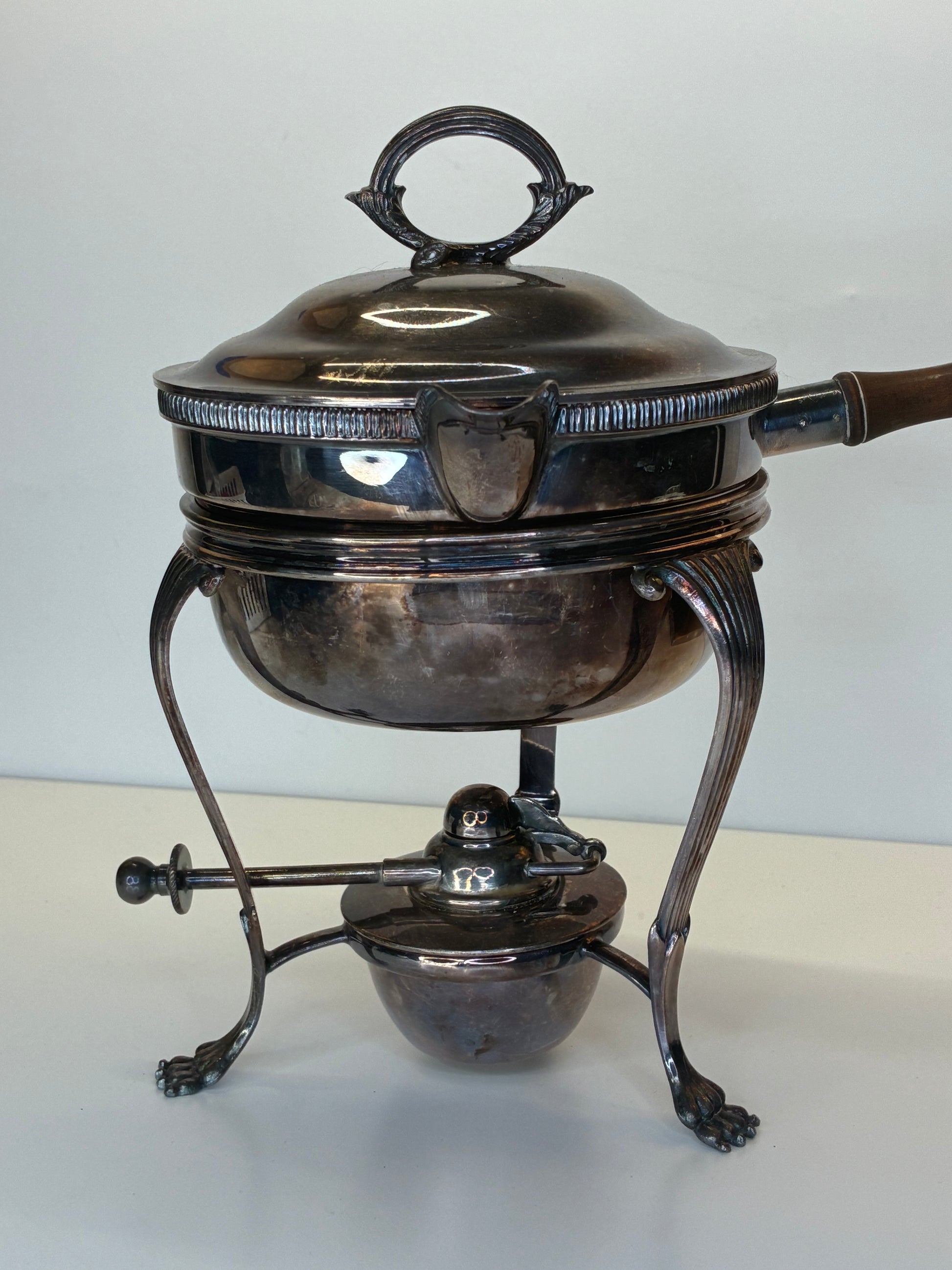 Antique Vintage 4 Piece Cavendish Chafing Dish Fondue Pot Soup Warmer Electroplated Nickle Silver Plated EPNS Made in England Engraved Monogram u201cESLu201d. 9 inches tall 9 1/2 inches width including wooden handle, beautiful claw feet. Four separate pieces with pouring spout. Excellent condition. No dents or scrapes. May need polish depending on Buyer's preference in silver presentation. 100% of sale benefits charity.
