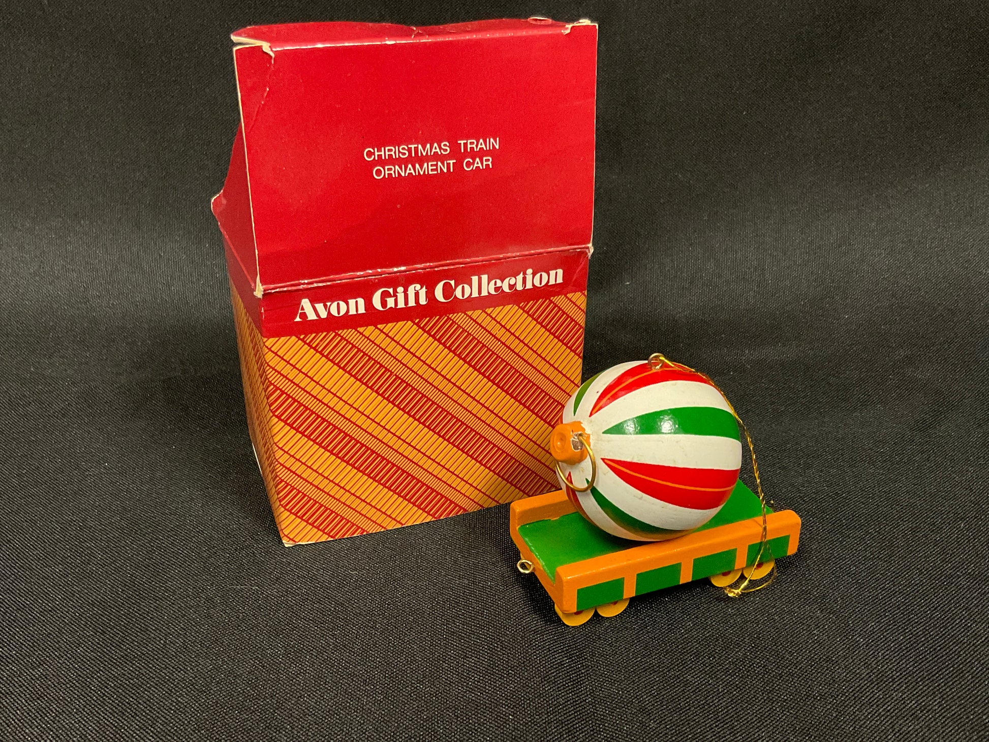 Avon Gift Collection Vintage 1987 Wooden Christmas Holiday Seasonal Train Ornament Car in Original Box. 100% of sale benefits charity.