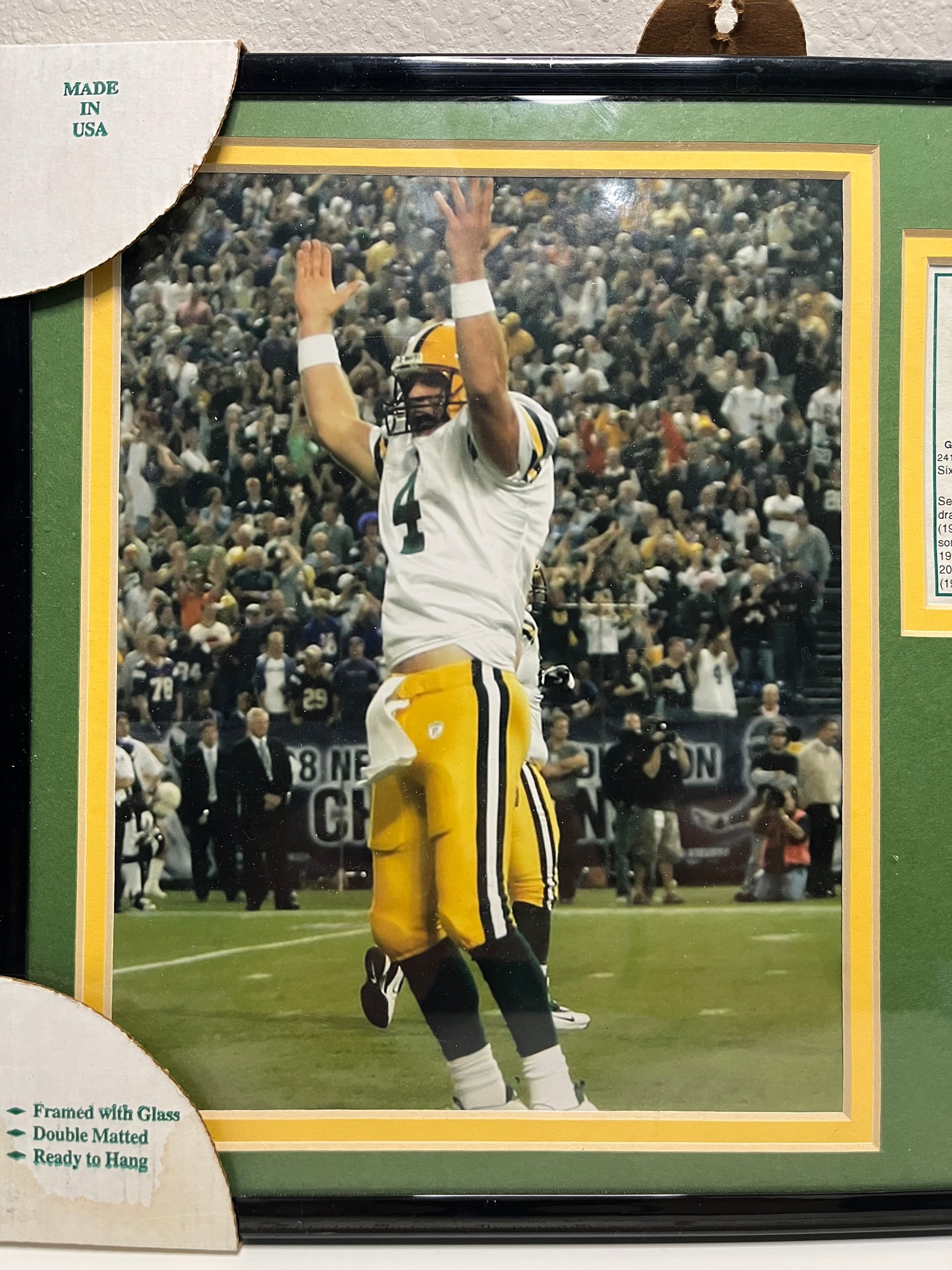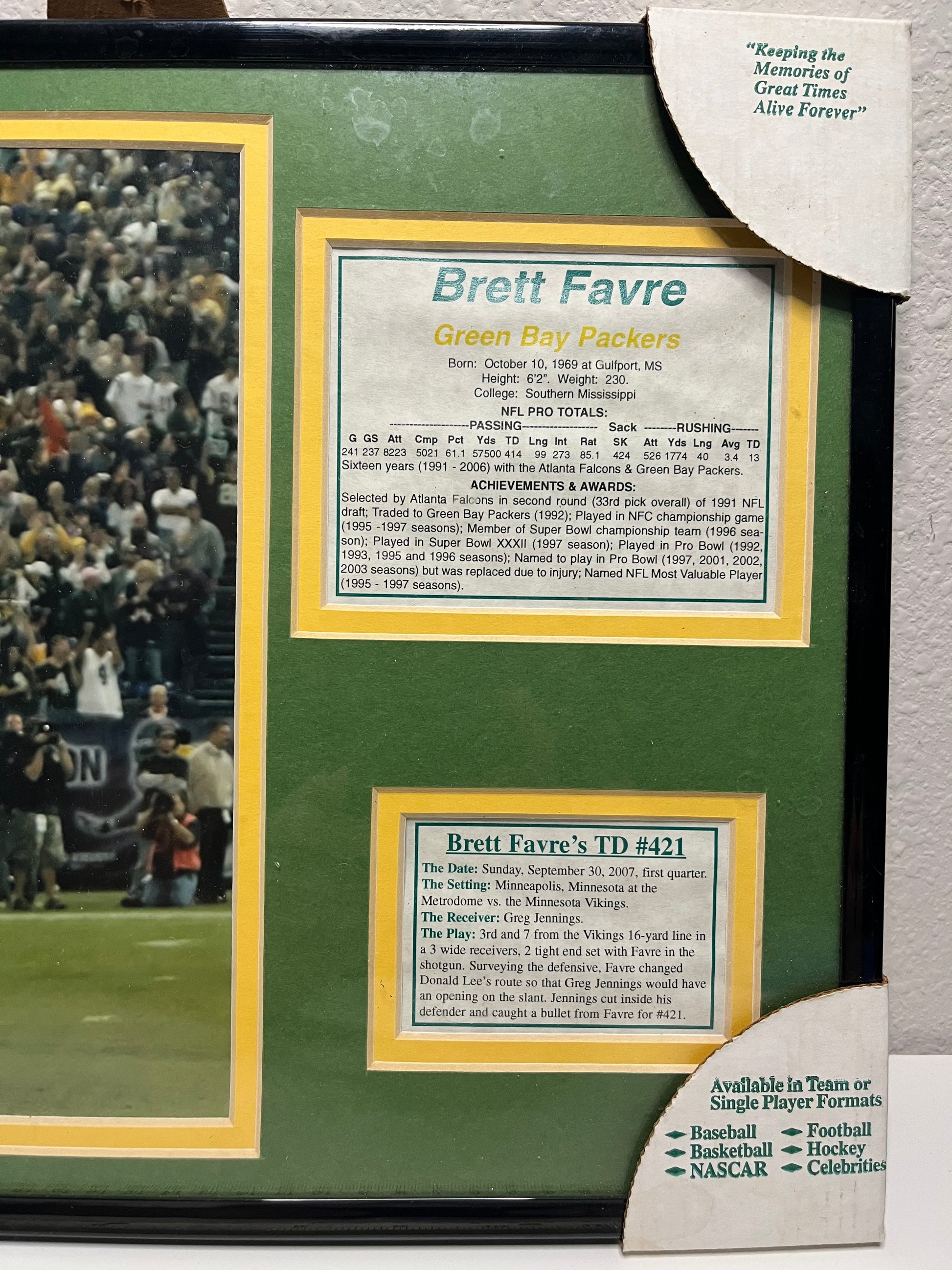 FRAMED DOUBLE MATTED BRETT FAVRE TD #451 COMMEMORATIVE DISPLAY.