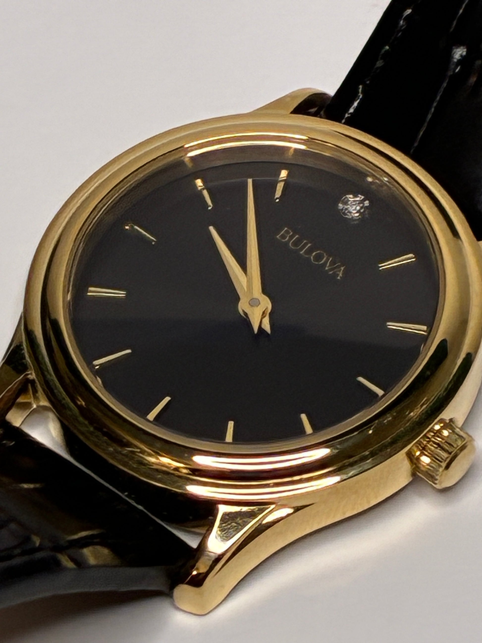 Elevate your style with this stunning Bulova women's wristwatch. The fixed gold-tone bezel adds a touch of luxury to the black stainless steel case, while the two-piece black leather strap completes the classic look. This watch features a round gold-indexed dial with stick indexes and a mineral crystal that protects it from scratches. With a quartz movement and water resistance of up to 30 meters, this watch is perfect for any occasion, whether it's a formal event or a casual day out. The watch also comes with its original box and packaging, making it a great gift for yourself or a loved one. Please see item description and photos of watch.