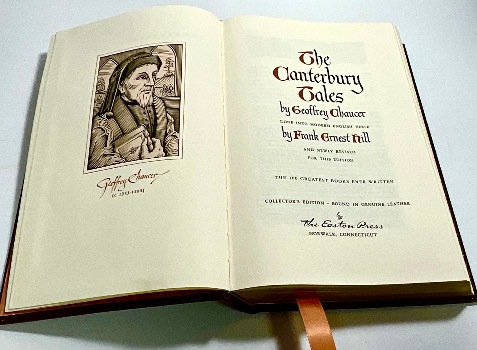 The Canterbury Tales by Geoffrey Chaucer Vintage 1978 The Easton Press 100 Greatest Books Ever Written Collector's Edition Leather Bound in Genuine Leather Hardback Hardcover Book. Slight cover damage on front and back cover (scratches and indentations). 100% of sale benefits charity.