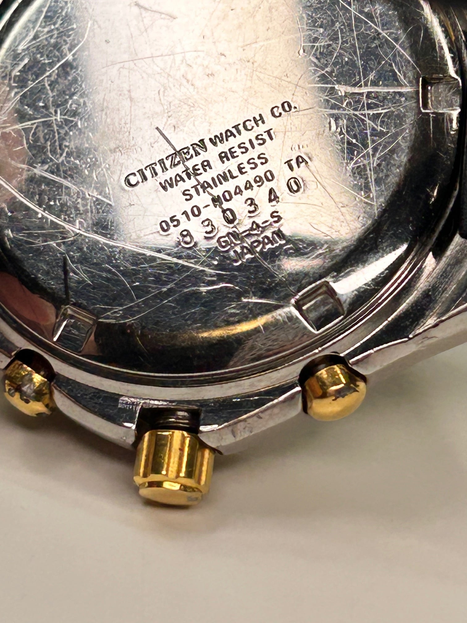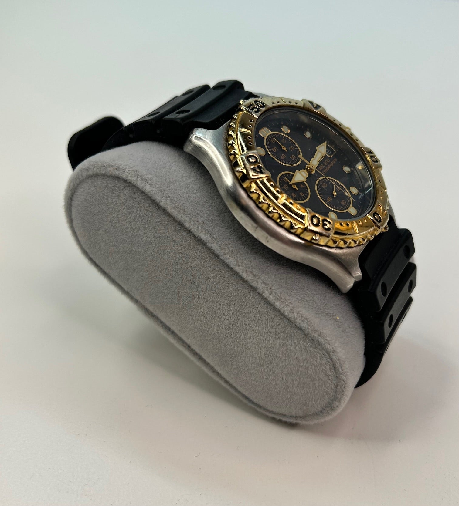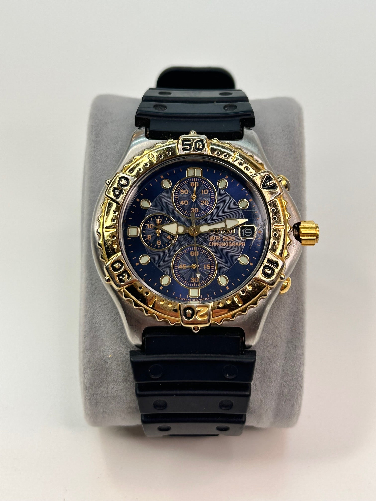 Citizen Gold Tone Stainless Steel Black Sport Band 200m Diver's Chronograph Men's Watch Model Number 0510-h04490 in Working Condition. Citizen Watch Company 830340 Japan. Luminous markers, Date display. Not in original box or package. Pre-owned. Scratches on caseback and small scratch on front surface. 100% of sale benefits charity.