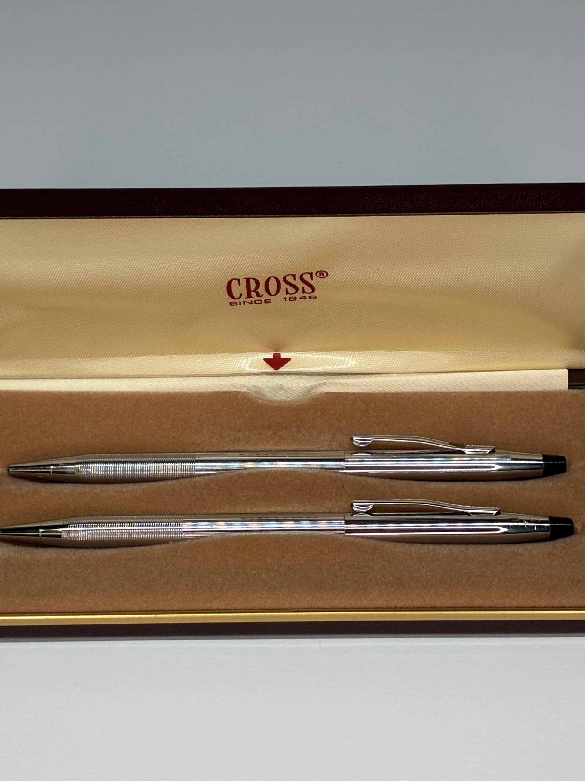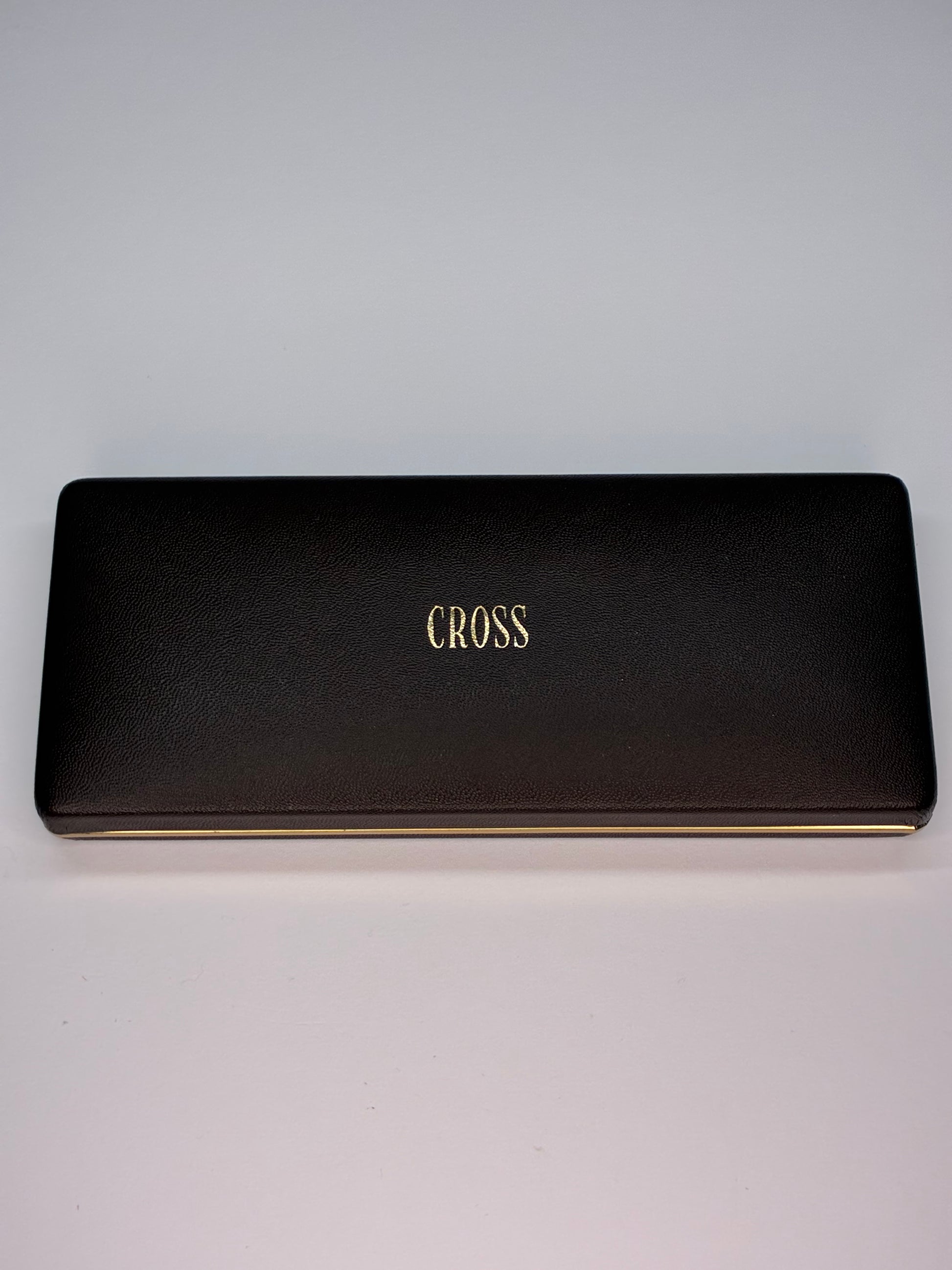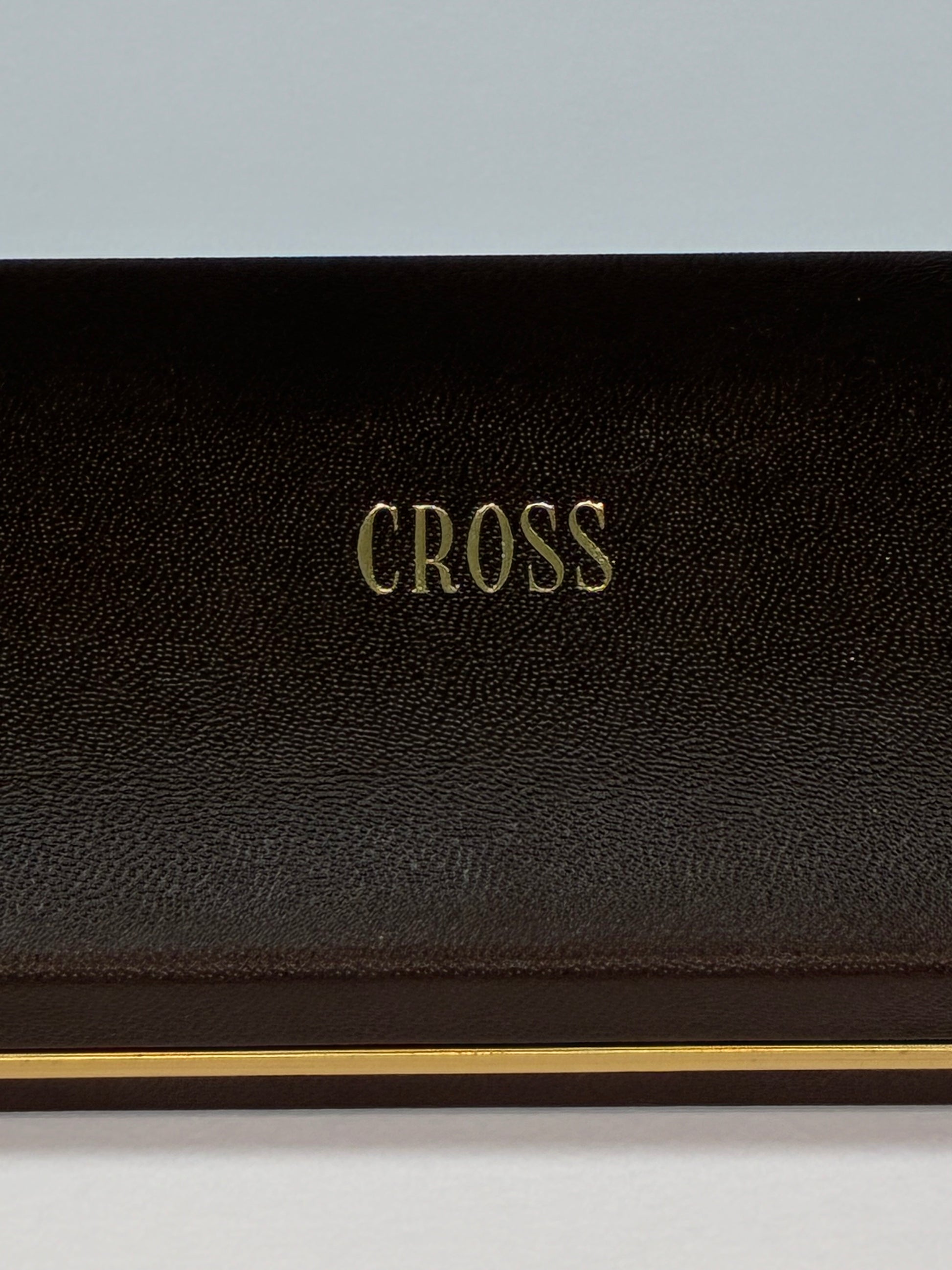 Cross Two-Piece Silvertone Ballpoint Pen Set Blue and Black Ink in Brown Leather Case with Goldtone Trim Lettering