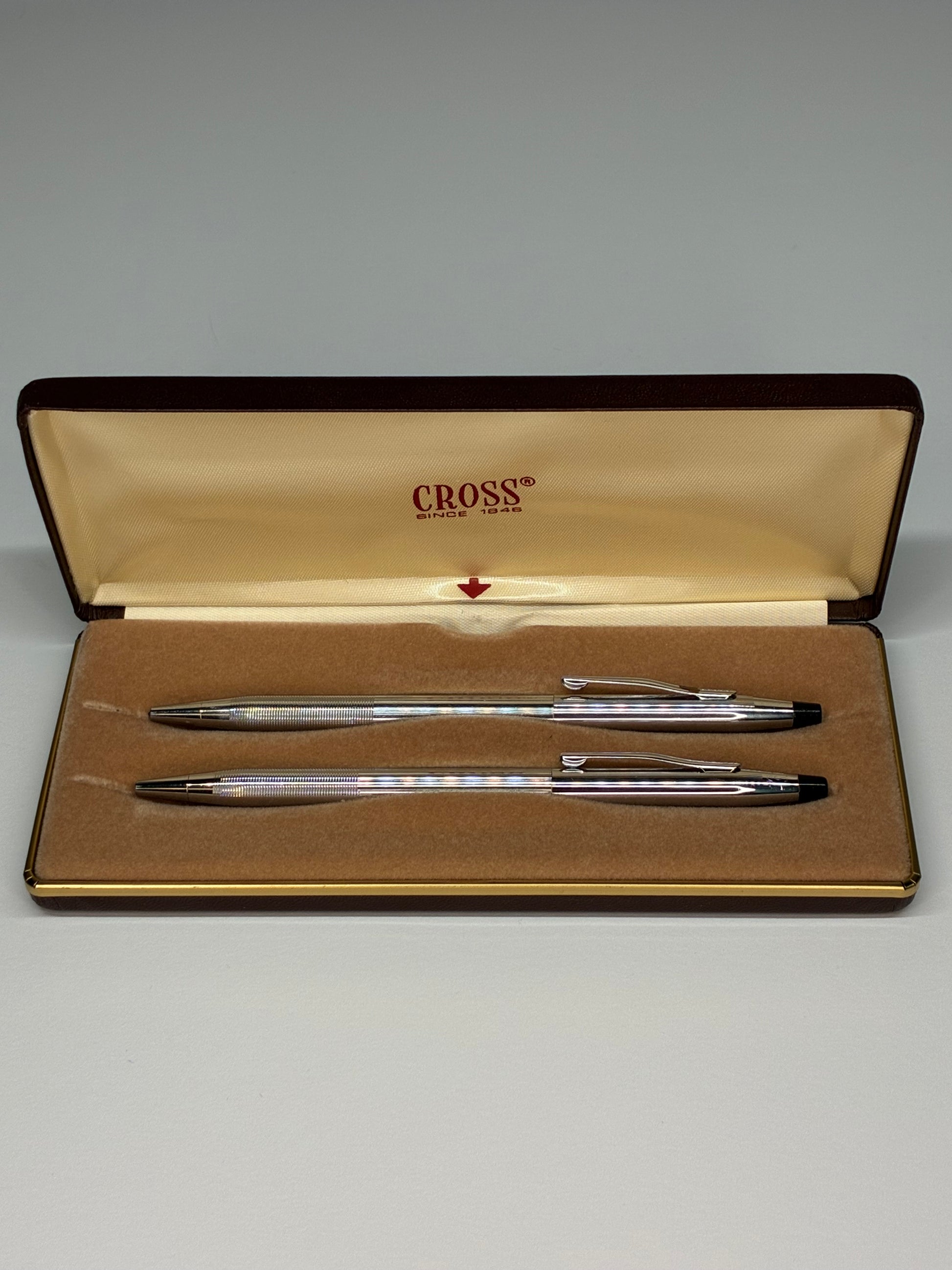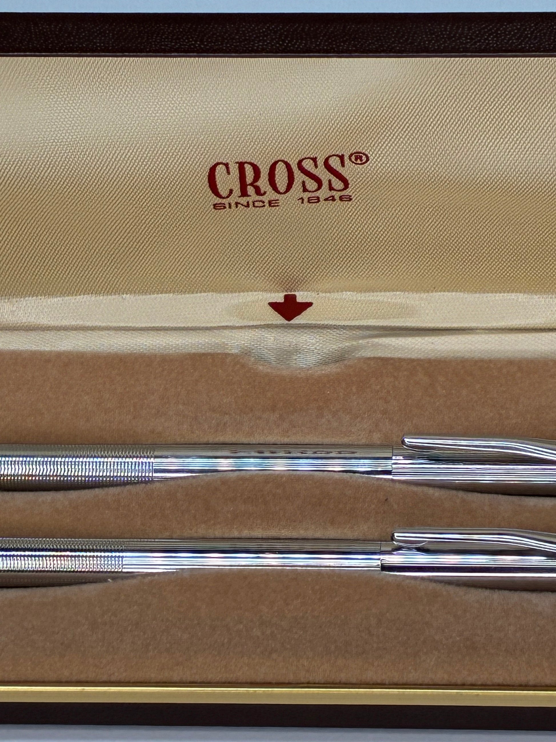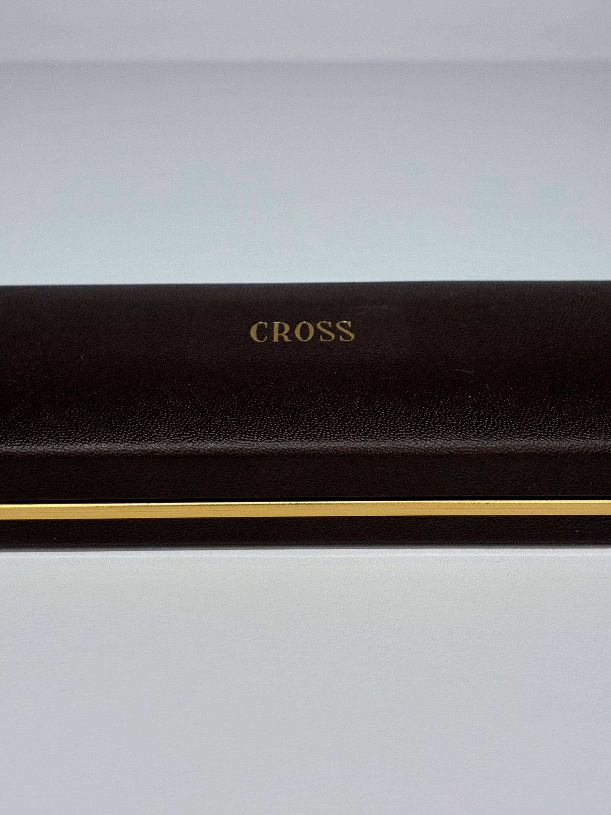 Cross Two-Piece Silvertone Ballpoint Pen Set Blue and Black Ink in Brown Leather Case with Goldtone Trim Lettering