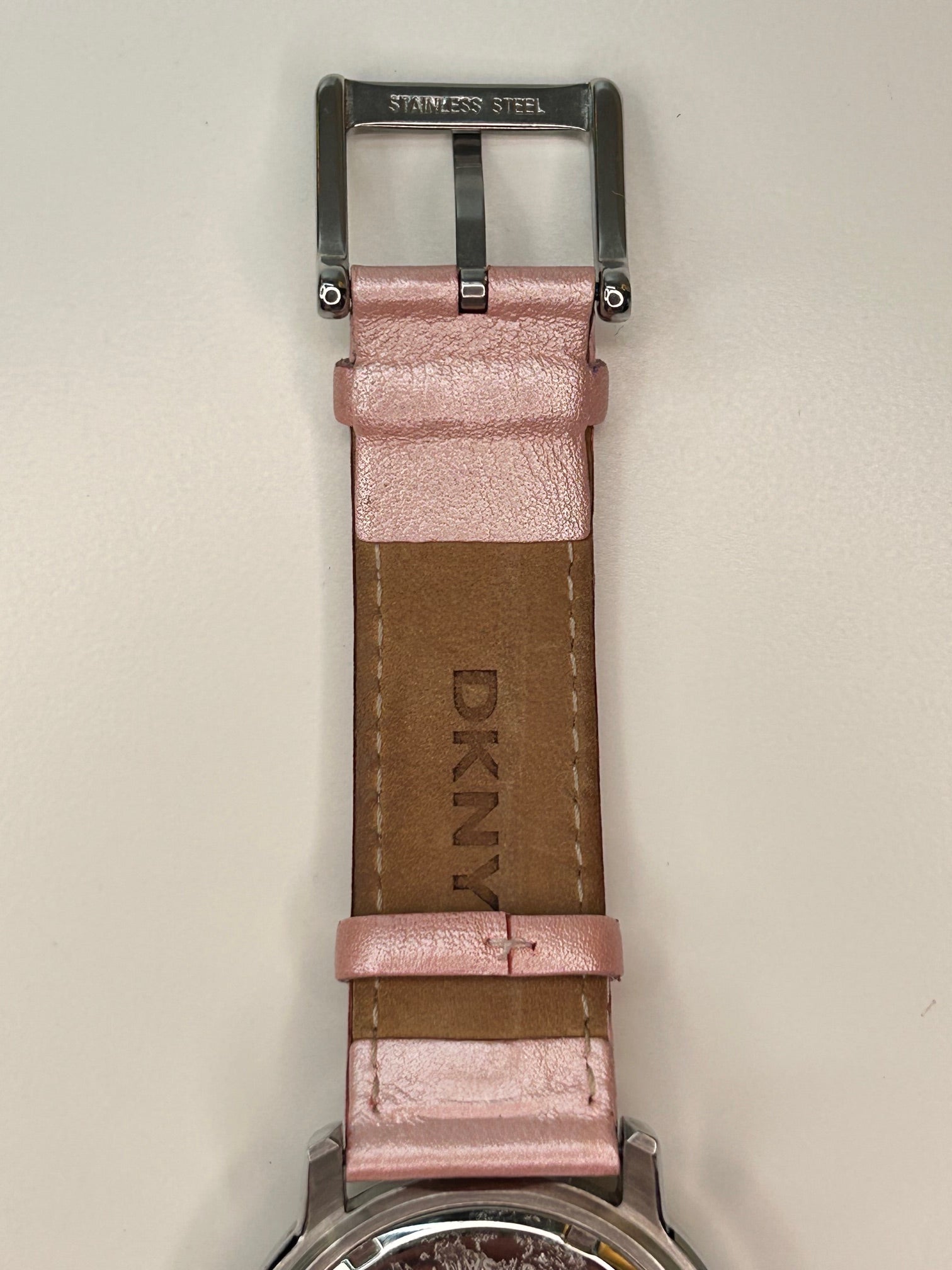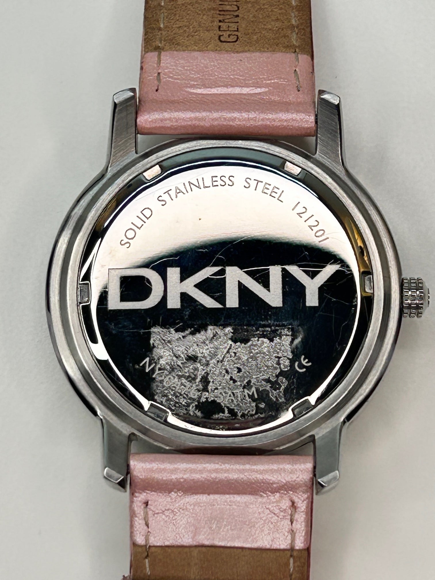 DKNY Pink Crystal Face Leather Band Water-Resistant Women's Watch Needs New Battery Not in Original Box or Package. Stainless steel casing. Price sticker residue on reverse. 100% of sale benefits charity.