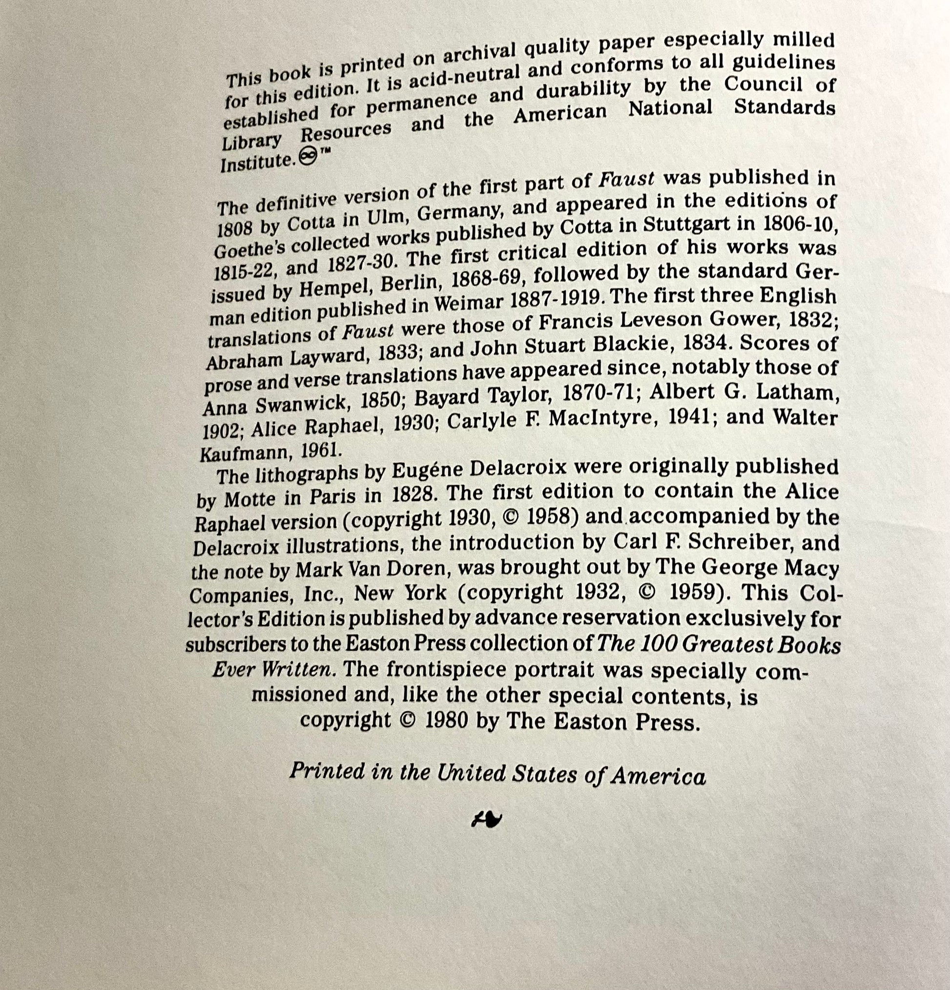 Faust by Johann Wolfgang Von Goethe Vintage 1980 The Easton Press 100 Greatest Books Ever Written Collector's Edition Leather Bound in Genuine Leather Hardback Hardcover Book Excellent Condition. 100% of sale benefits charity.