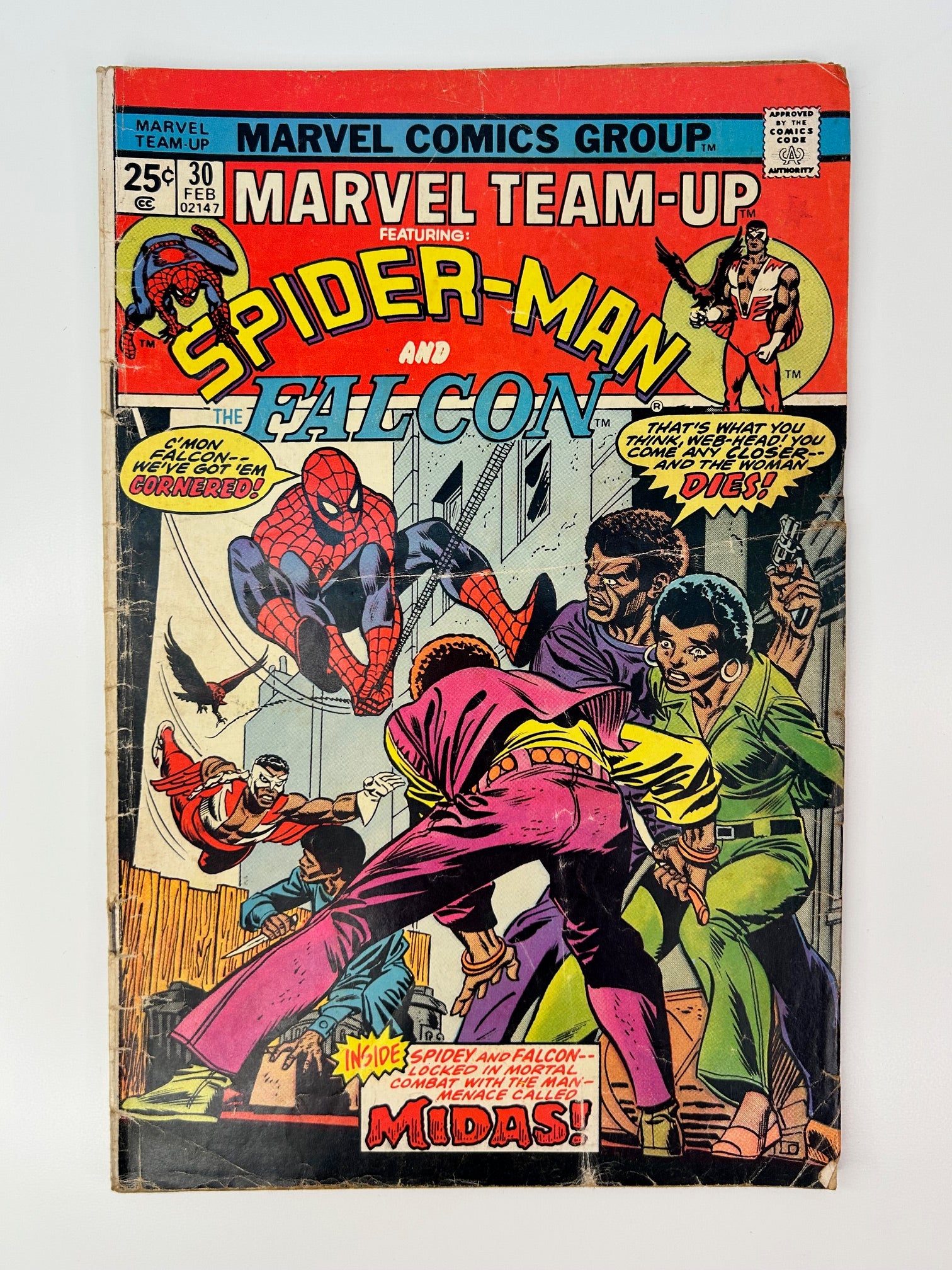 Marvel Team-Up Featuring Spider-Man and Falcon #30 Vintage February 1975 Marvel Group Comic Book. Visible crease on cover. See photos for condition. 100% of sale benefits charity.
