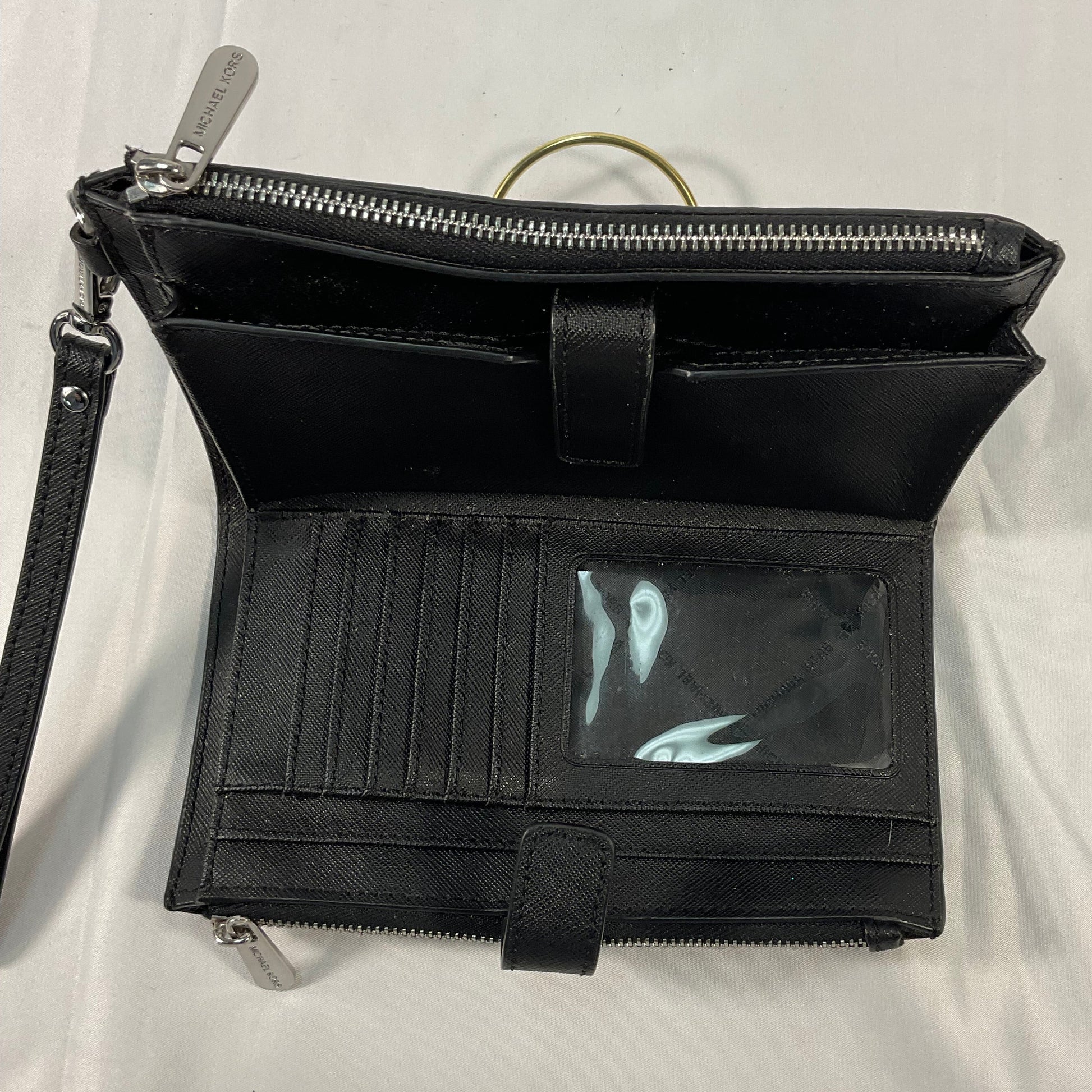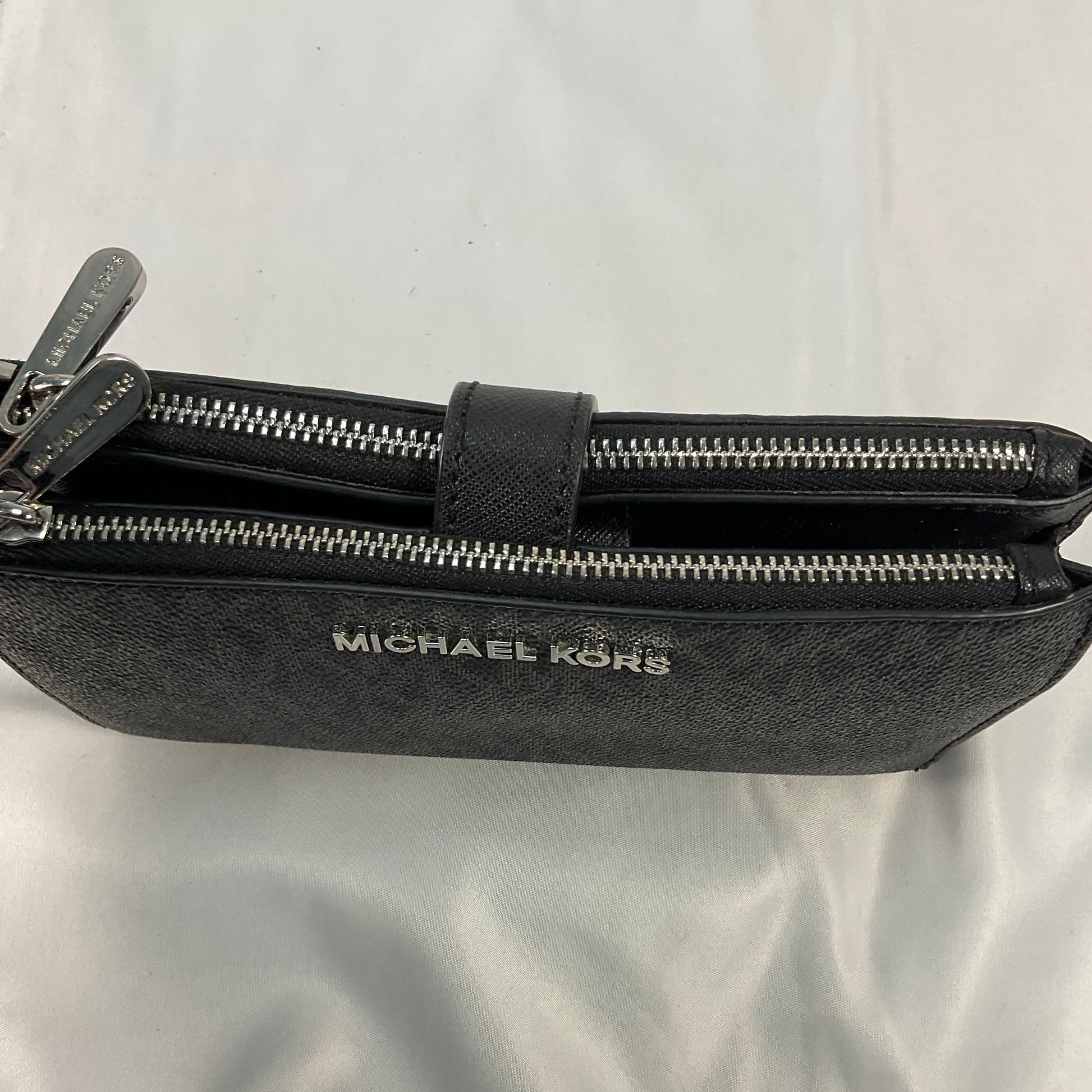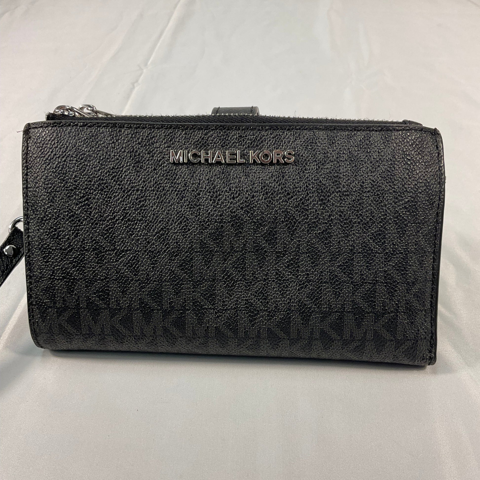 Michael Kors Signature Logo Double Sided Black Leather Zipper Clutch Wallet Carrier. 100% of sale benefits charity. Gently pre-owned, very minor scratches. See photos for condition details.