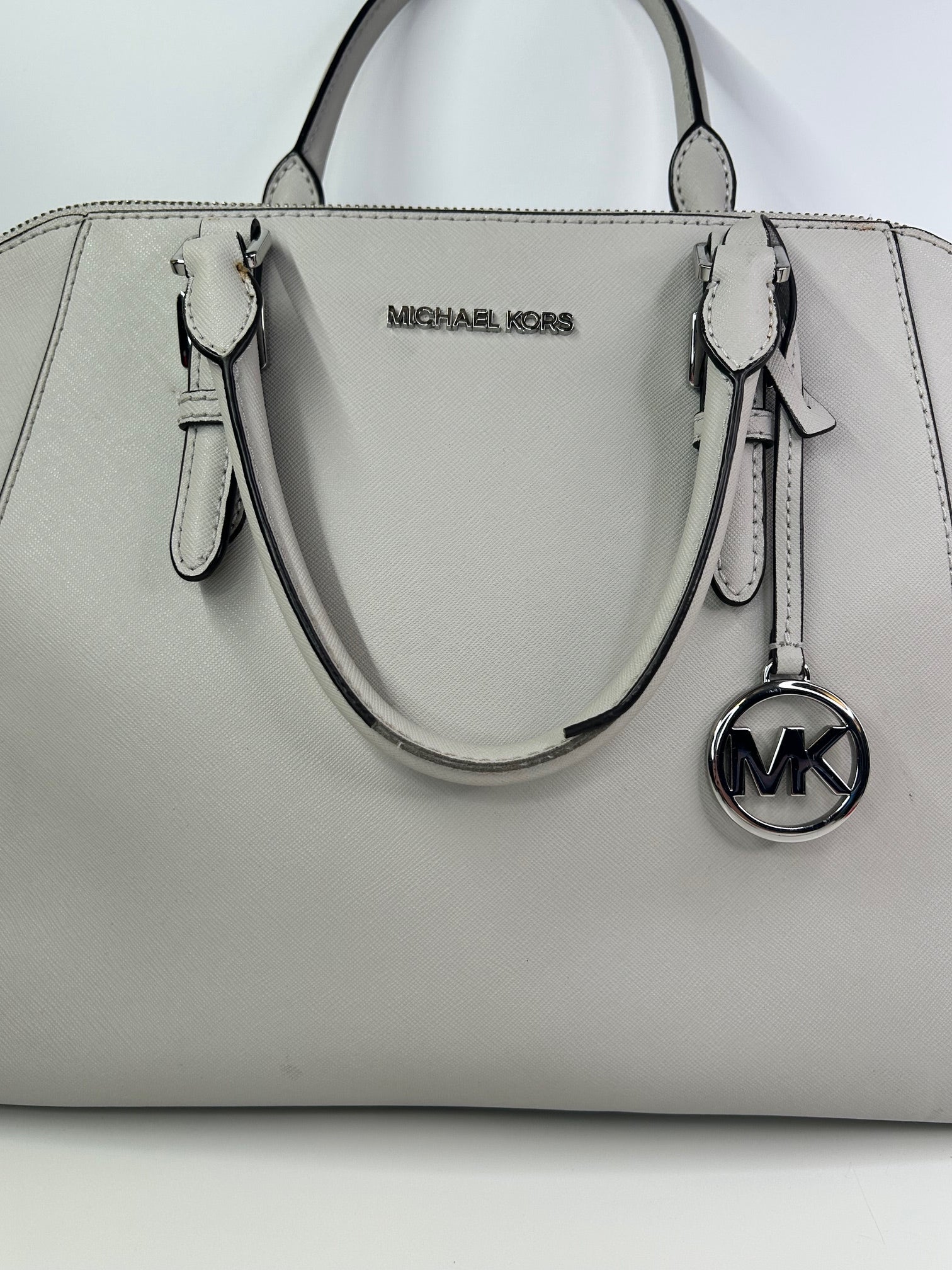 Michael Kors Ciara Large Light Stone Leather Top Zip Satchel Crossbody Purse Bag. Not in original box or package. Pre-owned. Slight wear on handles (pictured). Slight discoloration inside of zipper (pictured). 100% of sale benefits charity.