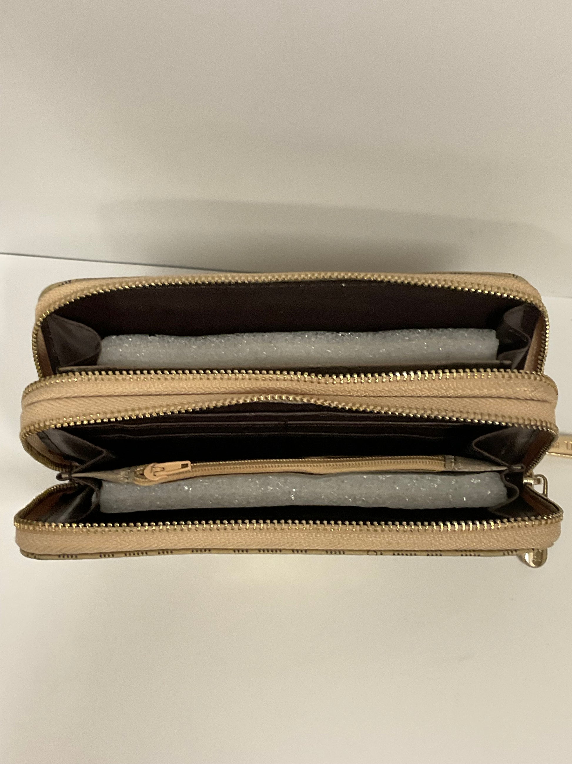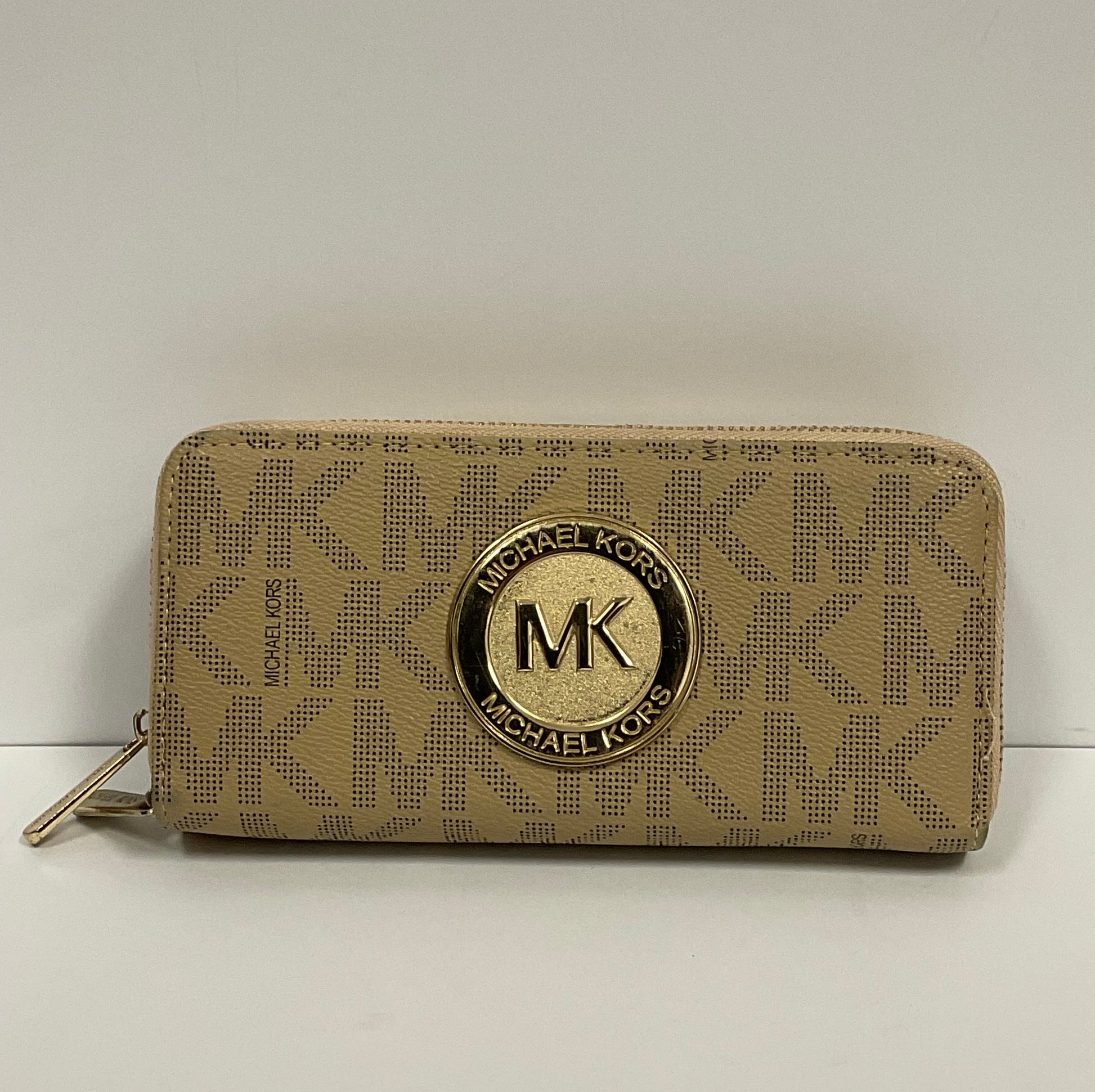 Michael Kors MK Logo Champagne Beige Tan Leather Wallet Clutch New Without Tags Unused. Not in original box or package. Slight stitching snag on right side. 100% of sale benefits charity.