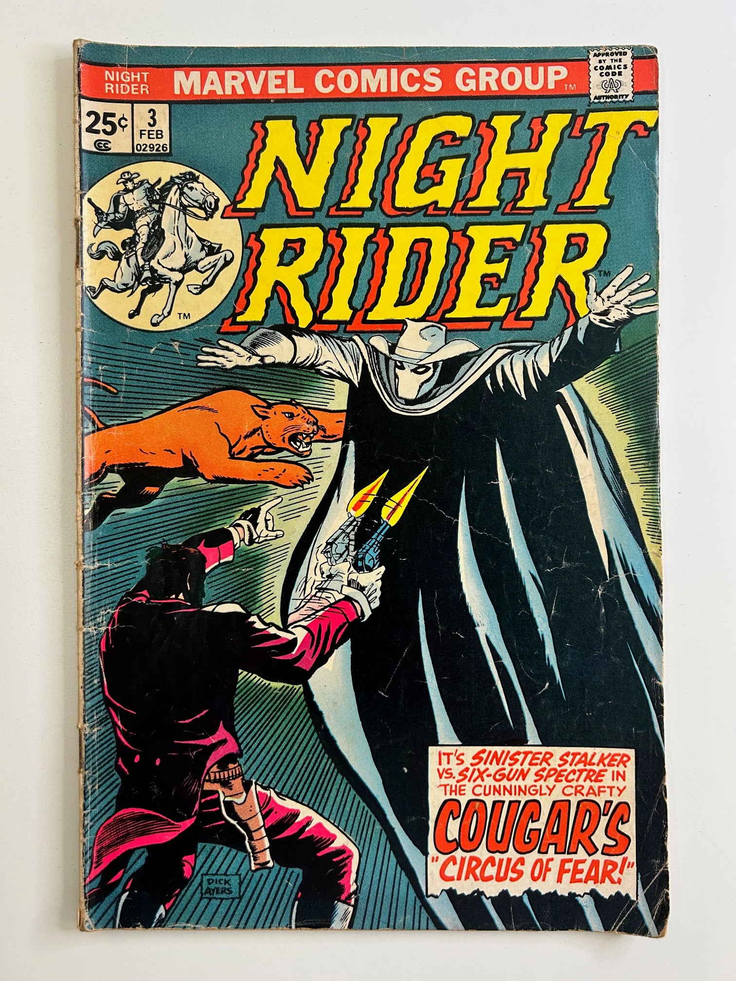 Night Rider #3 Vintage February 1975 Cougar's Circus of Fear Marvel Group Comic Book. See photos for condition. Visible age related wear. 100% of sale benefits charity.
