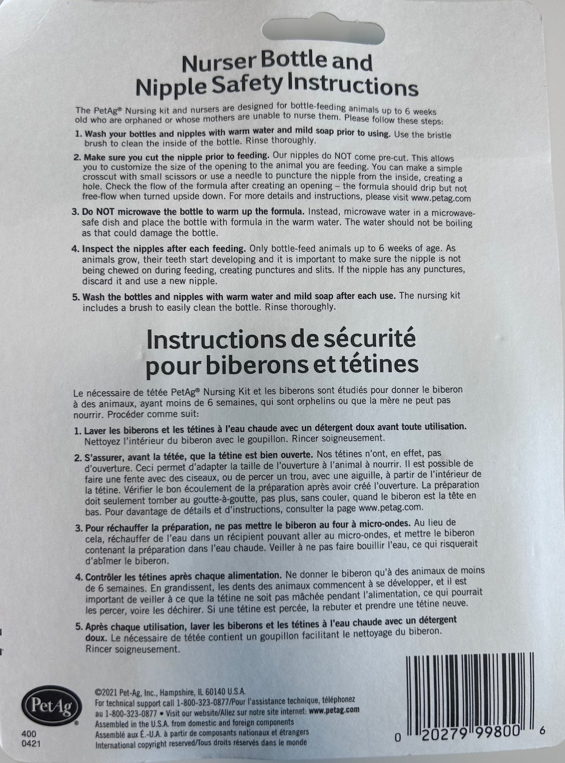 Pet-Ag Nursing Kit for Small Animals 2 oz Bottle, Cap, 5 Nipples, Cleaning Brush New in Box Sealed. Promotes the Natural Feeding of Liquids to Baby Animals. 100% of sale benefits charity.