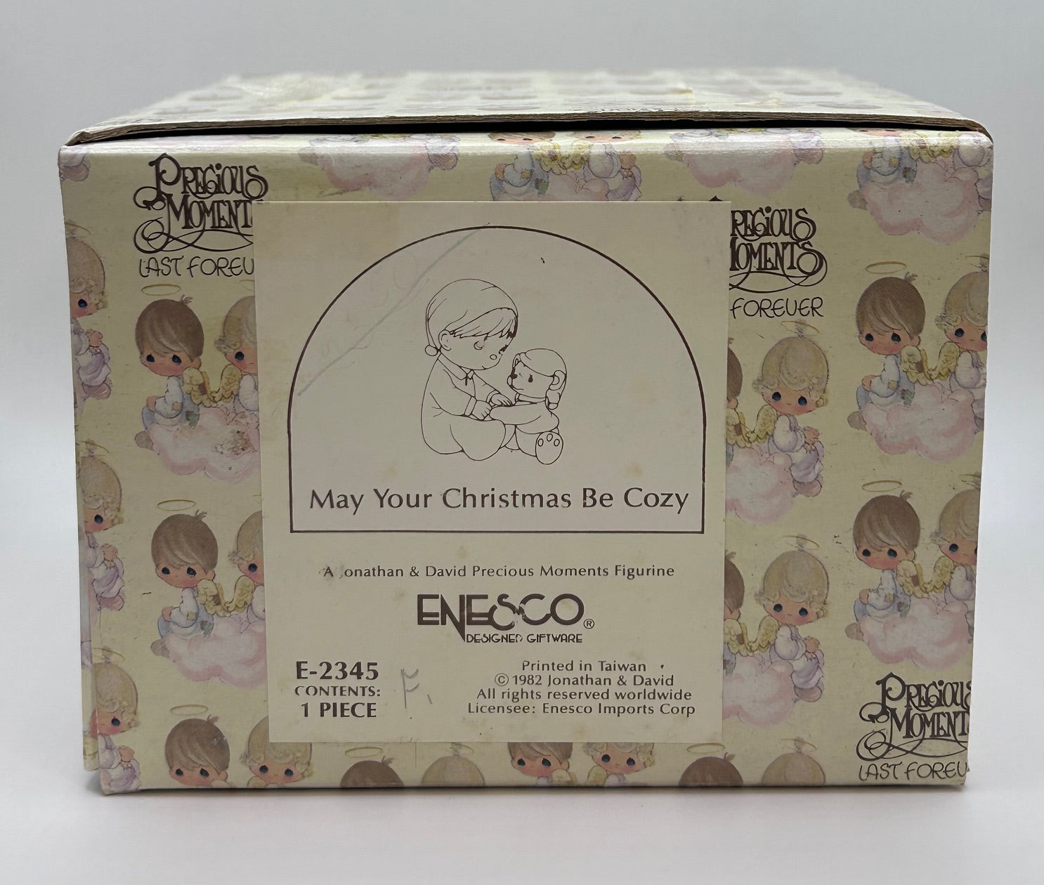 Precious Moments Vintage 1982 May Your Christmas Be Cozy Hand Painted Porcelain Collectible Figurine Original Box Mint Condition by Enesco. 100% of sale benefits charity.