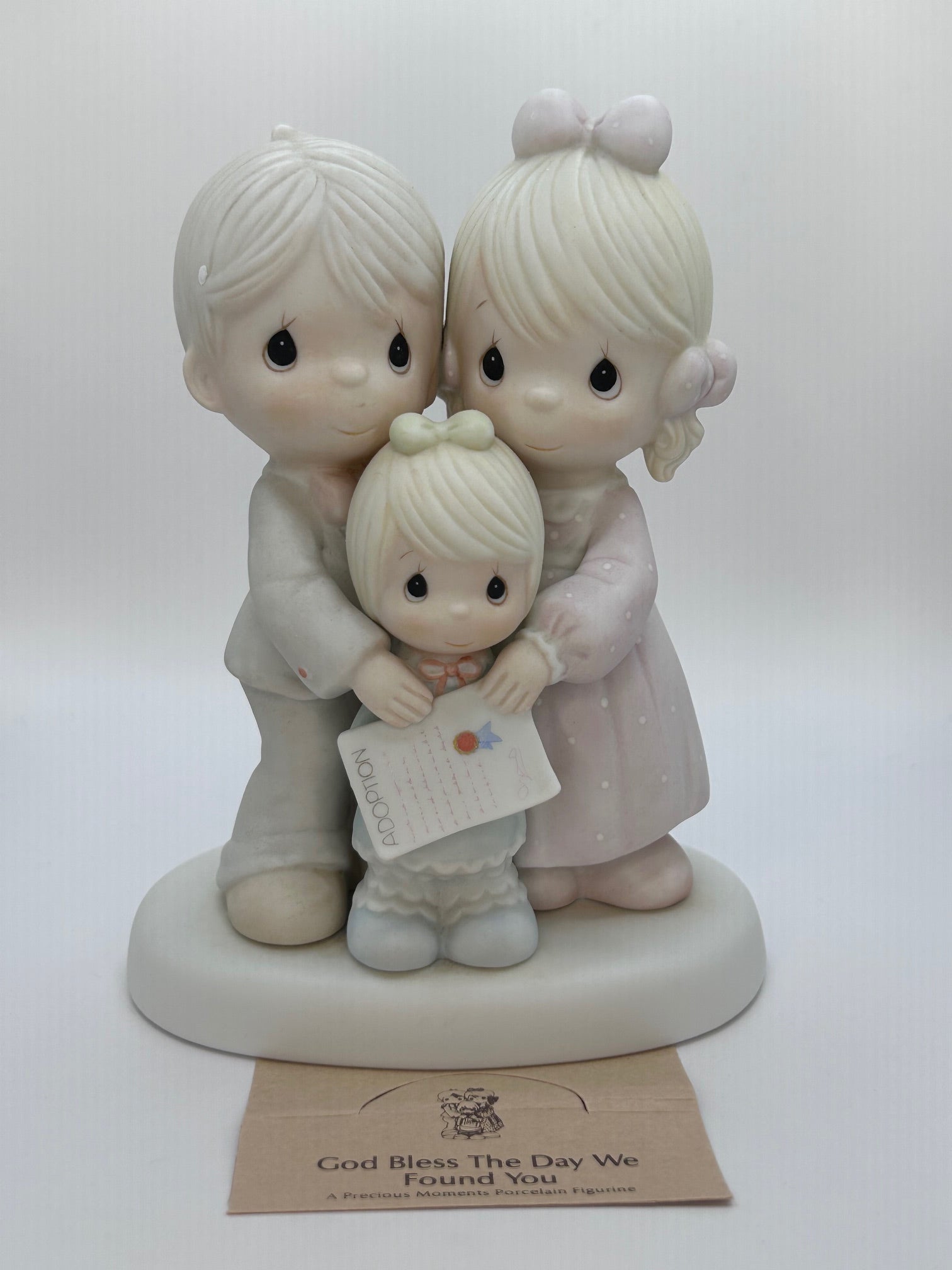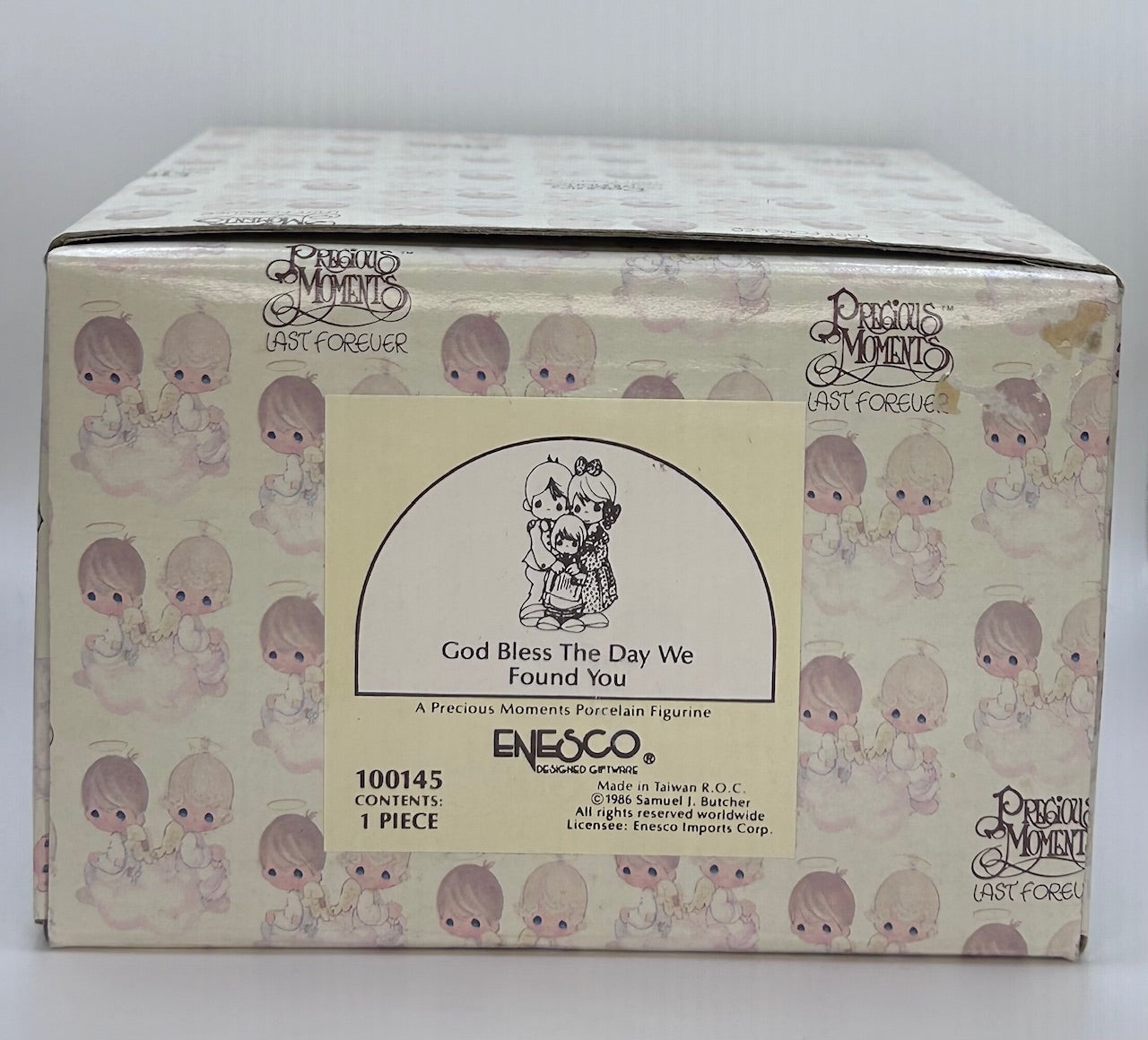 Precious Moments Vintage 1986 God Bless The Day We Found You Hand Painted Porcelain Collectible Figurine Original Box Mint Condition by Enesco Samuel J. Butcher 100145. 100% of sale benefits charity.