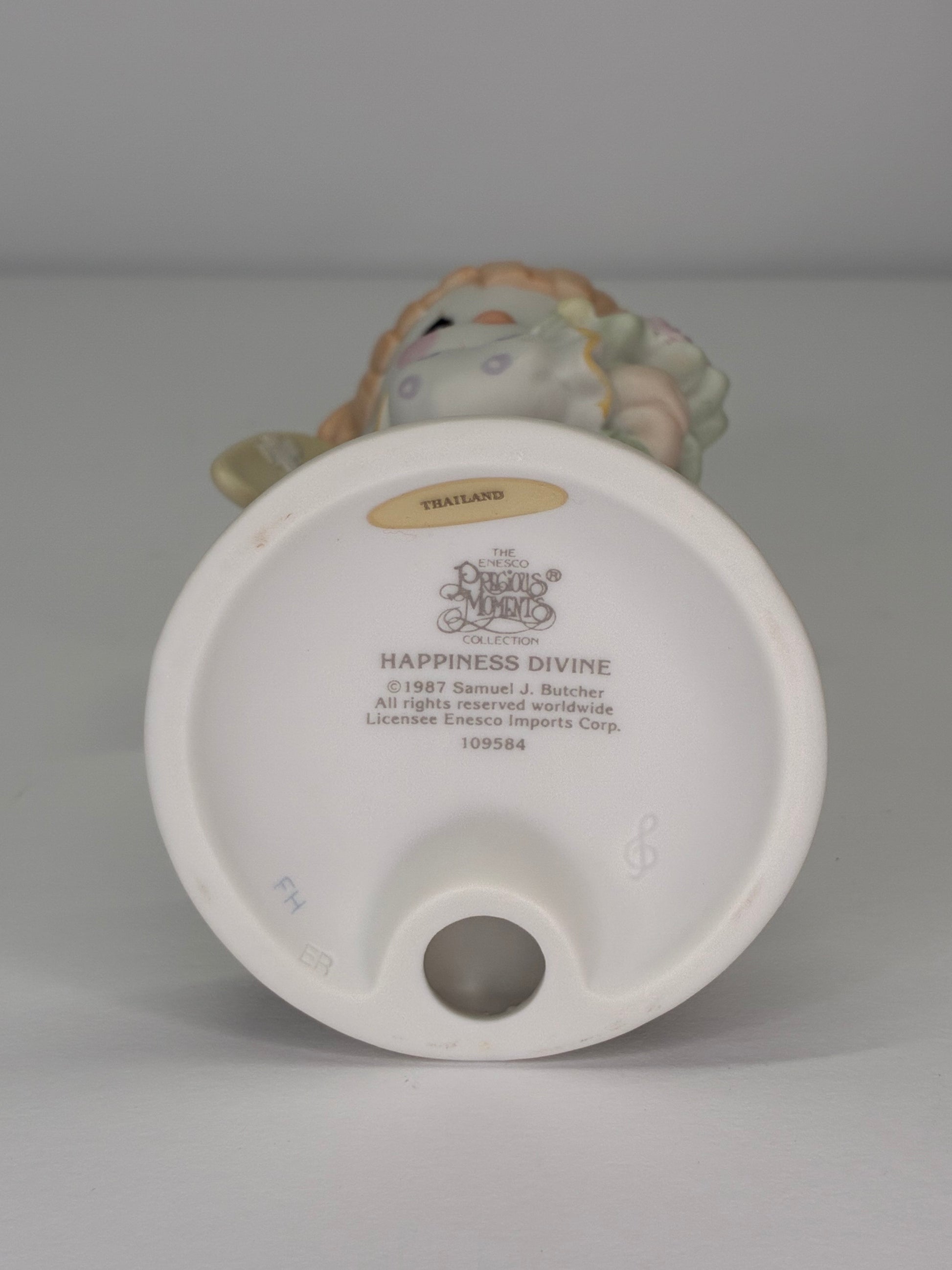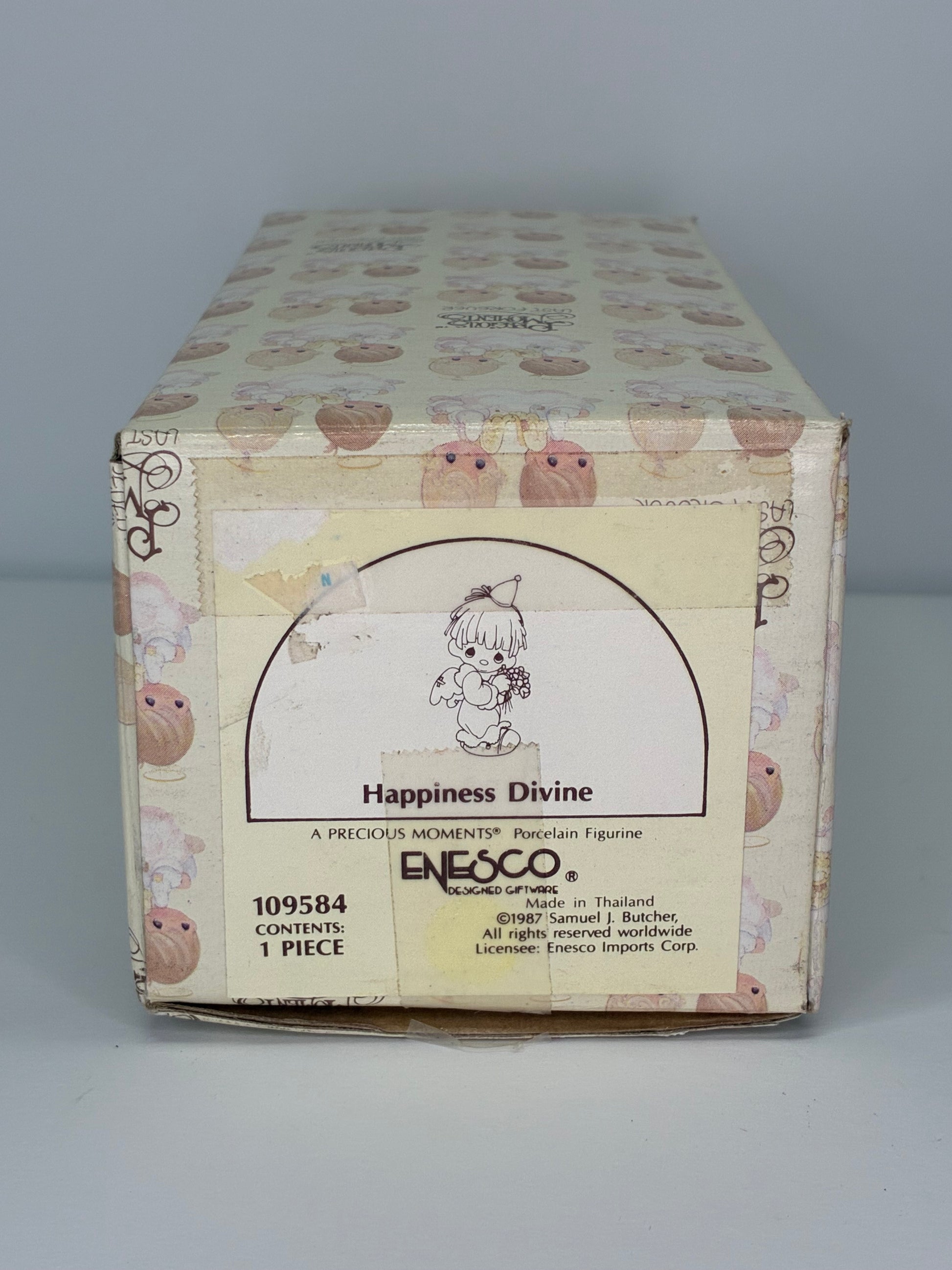 Precious Moments Vintage 1987 Happiness Divine Hand Painted Porcelain Collectible Figurine Original Box Mint Condition by Enesco Samuel J. Butcher 109584. 100% of sale benefits charity.