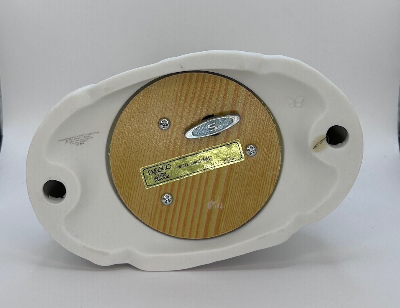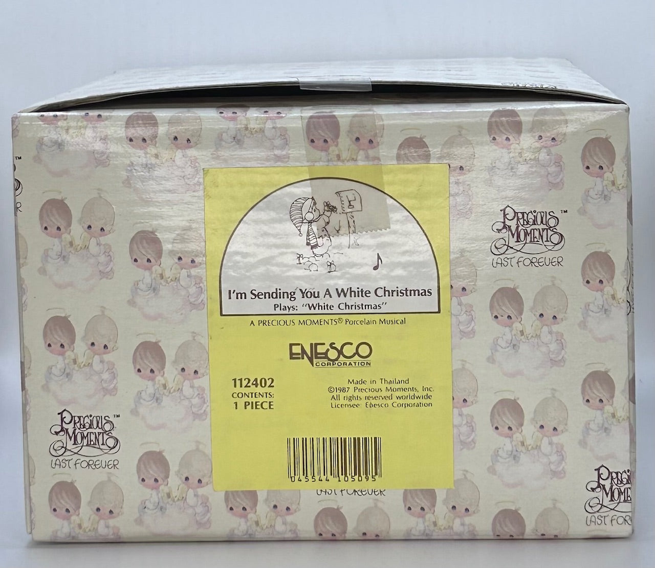 Precious Moments Vintage 1987 I'm Sending You A White Christmas Music Box Plays White Christmas Hand Painted Porcelain Collectible Figurine Original Box Mint Condition by Enesco 112402. 100% of sale benefits charity.