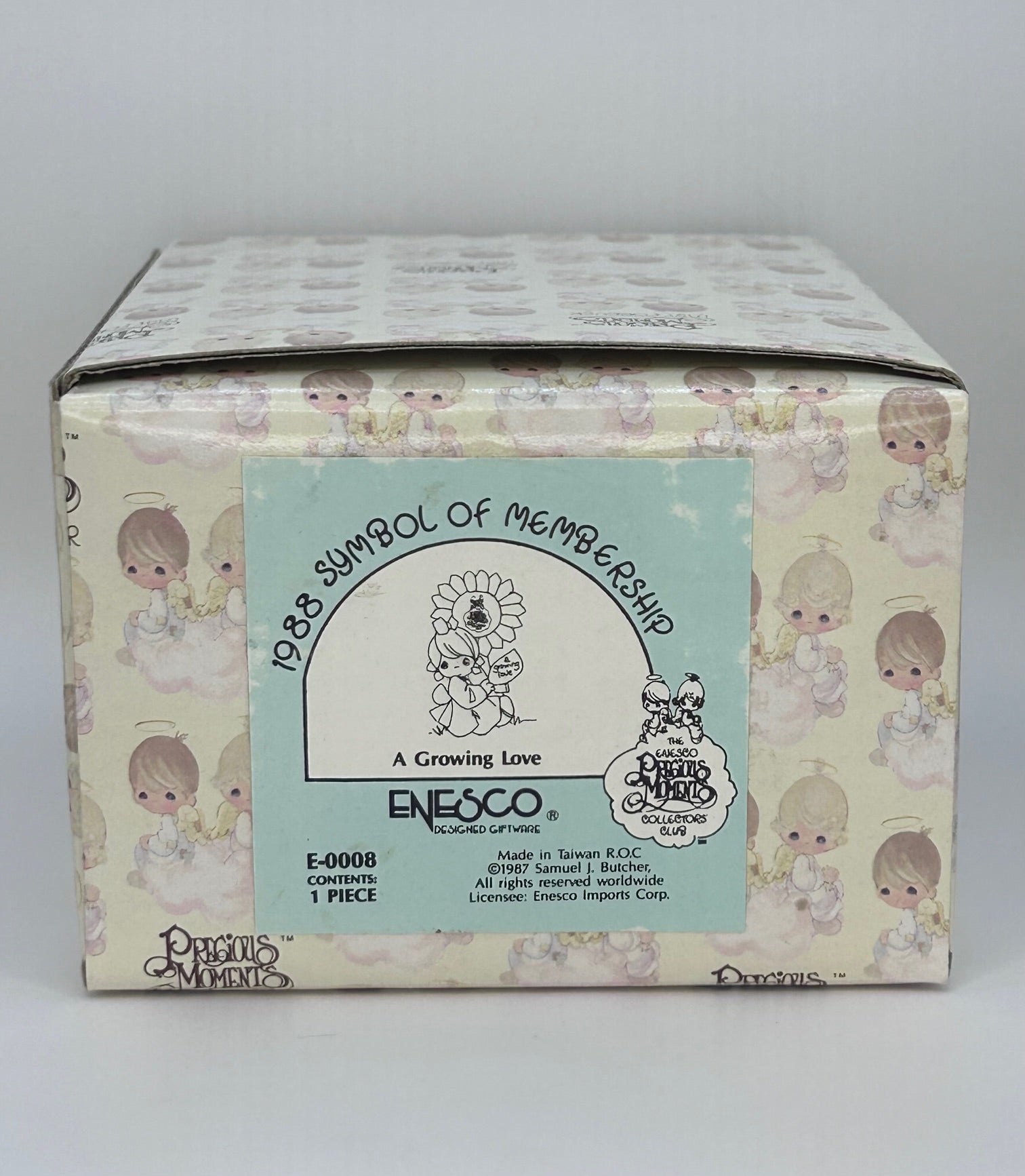 Precious Moments Vintage 1988 Symbol of Membership A Growing Love Hand Painted Porcelain Collectible Figurine Original Box Mint Condition by Enesco E-0008. 100% of sale benefits charity.