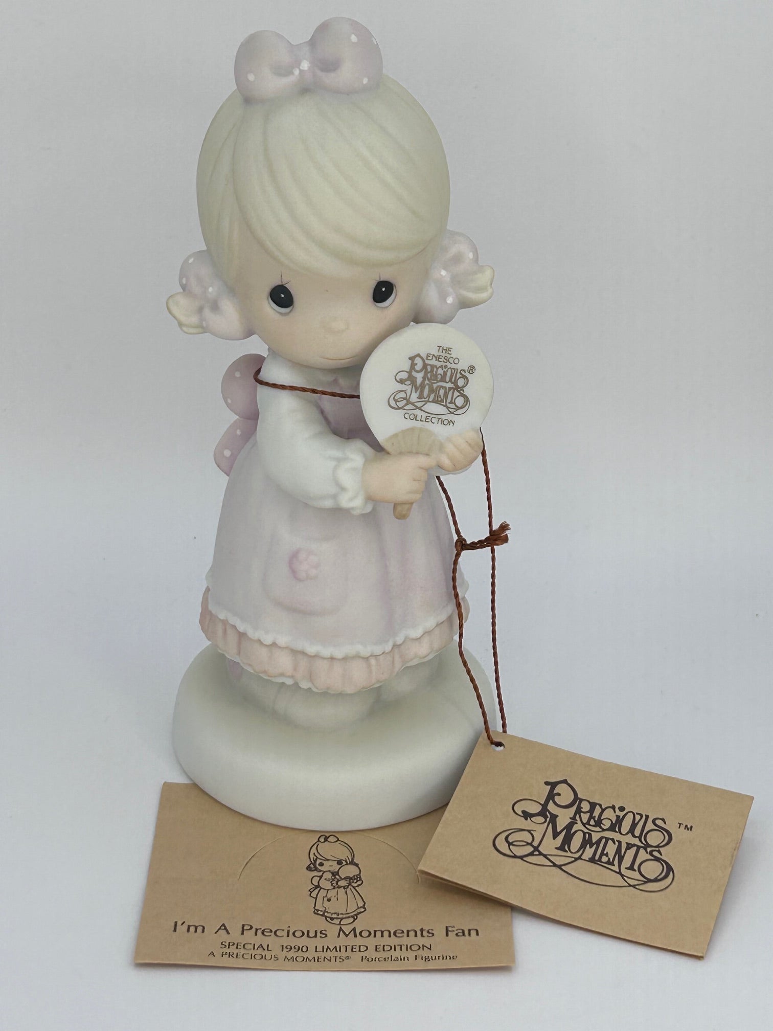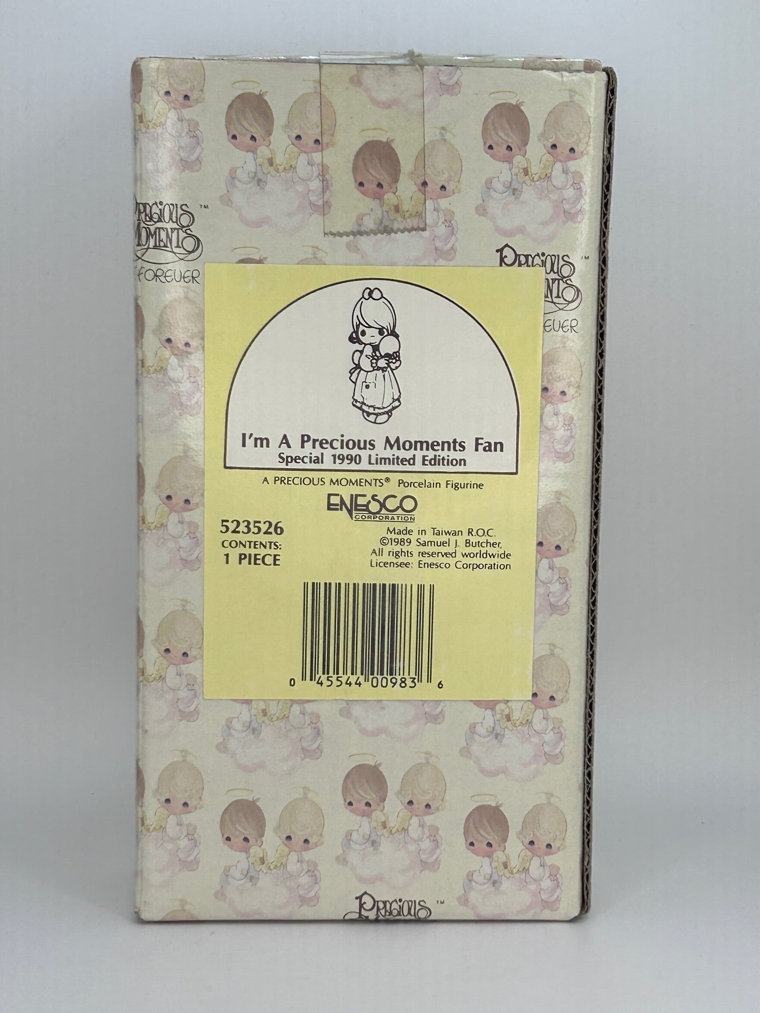 Precious Moments Vintage 1989 Special 1990 Limited Edition I'm A Precious Moments Fan Hand Painted Porcelain Collectible Figurine Original Box Mint Condition by Enesco 523526. 100% of sale benefits charity.
