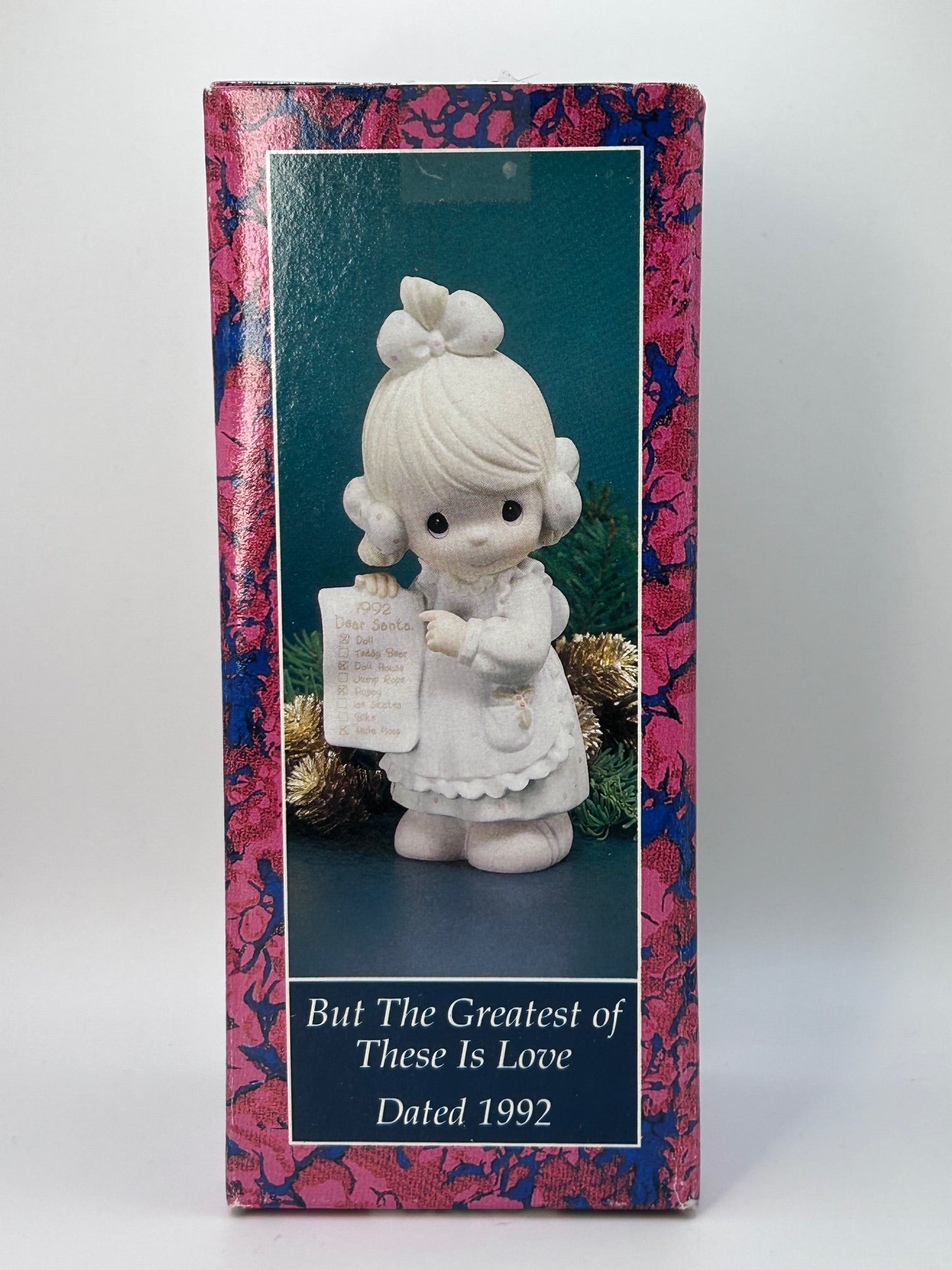 Precious Moments Vintage 1992 But The Greatest of These Is Love Hand Painted Porcelain Collectible Figurine Original Box Mint Condition by Enesco 527688. 100% of sale benefits charity.