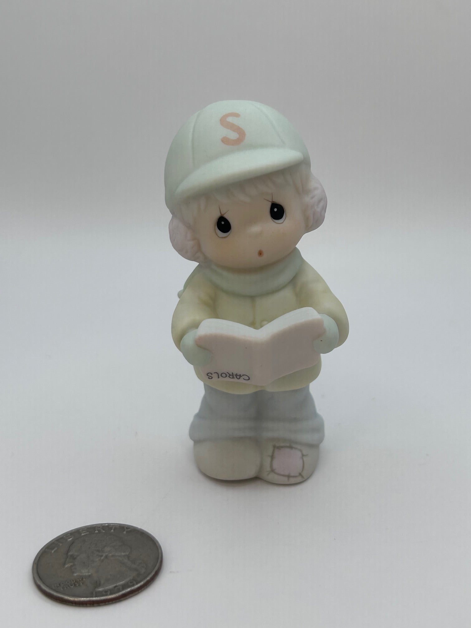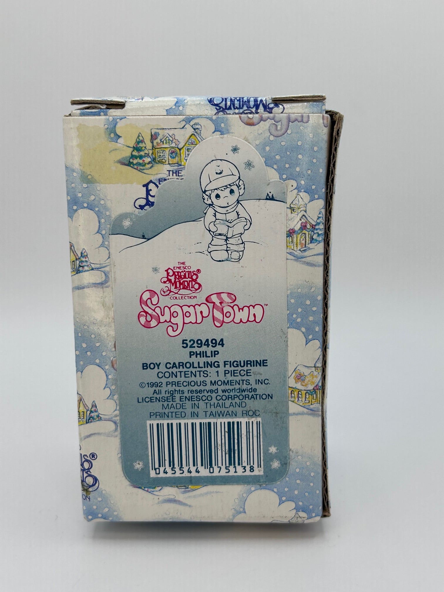Precious Moments Vintage 1992 Sugar Town Philip Boy Carolling Figurine Porcelain Collectible Original Box Mint Condition by Enesco 529494. 100% of sale benefits charity.