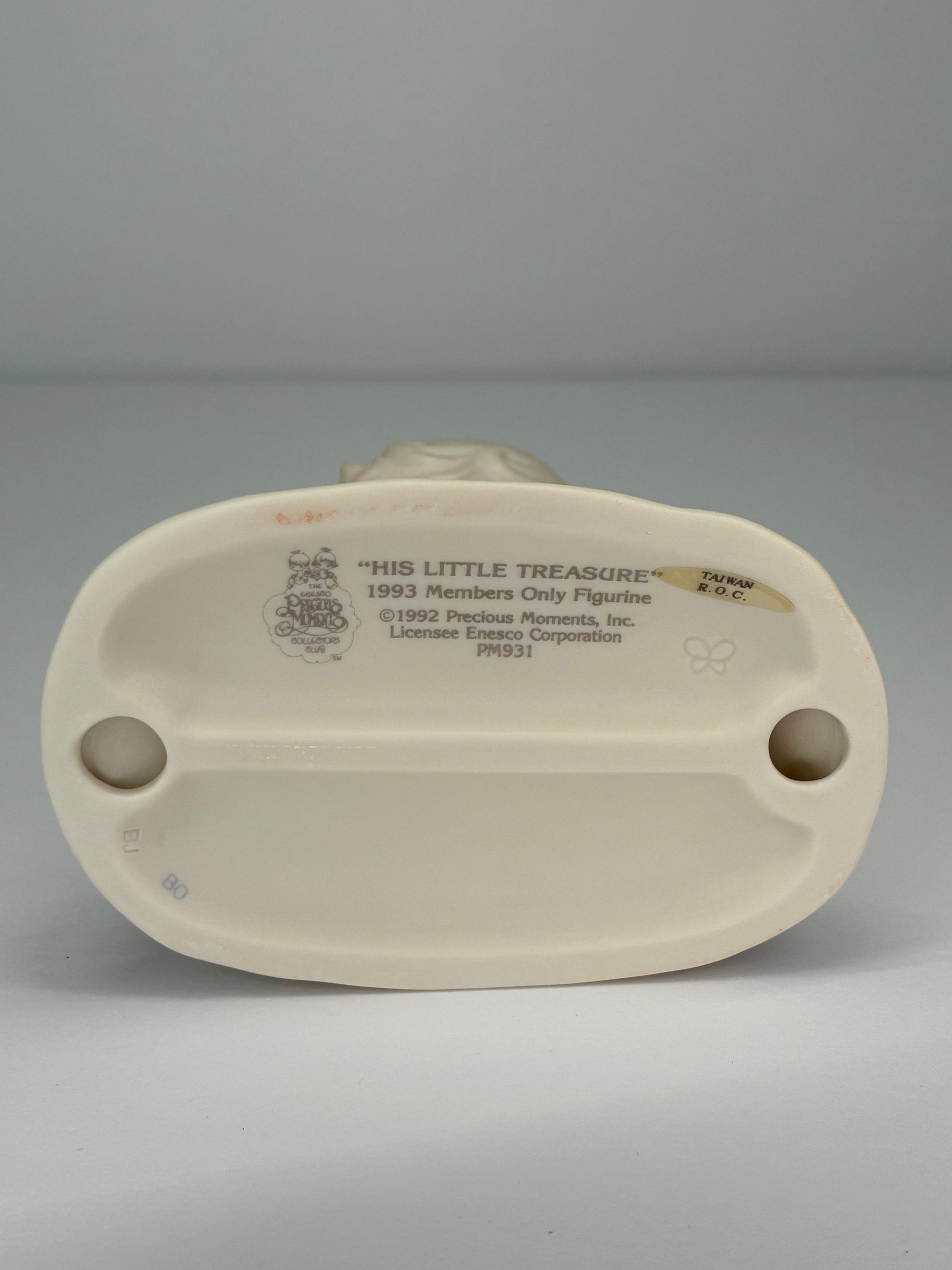 Precious Moments Vintage 1993 Members Only Figurine His Little Treasure Hand Painted Porcelain Collectible Figurine Original Box Mint Condition by Enesco PM931. 100% of sale benefits charity.