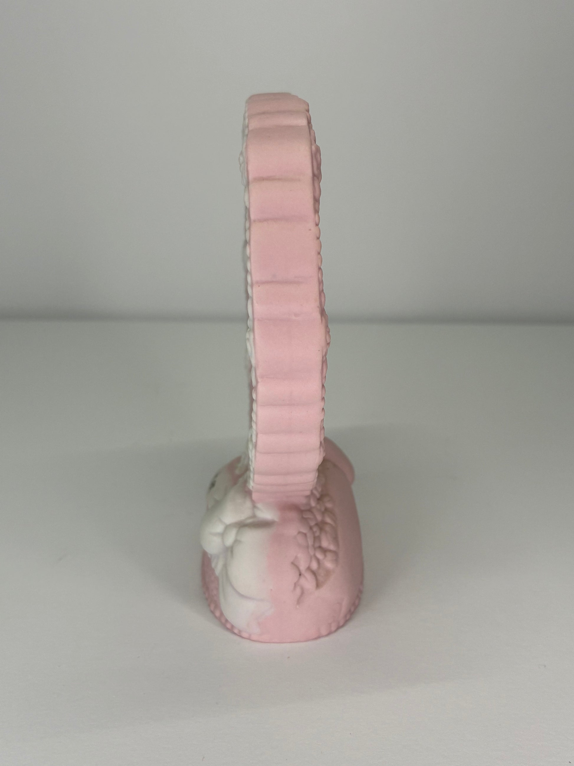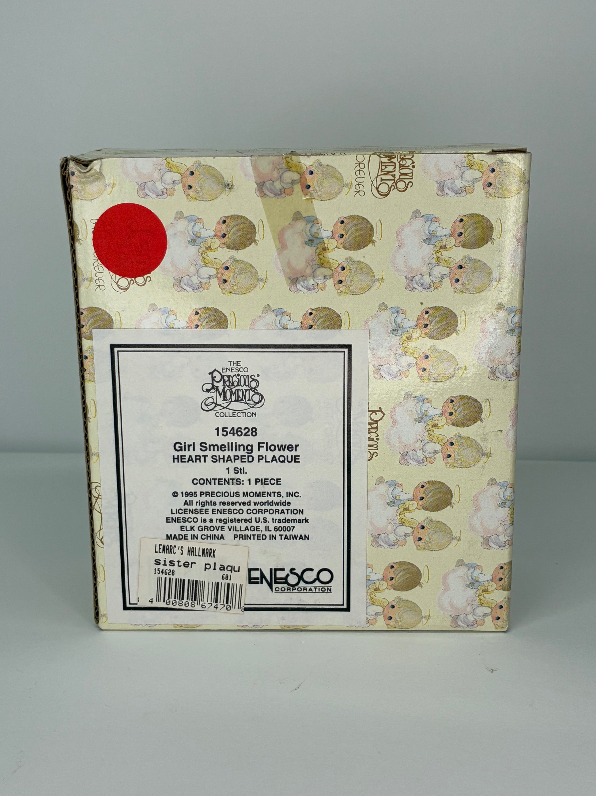 Precious Moments Vintage 1995 For My Sister Heart Shaped Plaque Girl Smelling Flower Hand Painted Porcelain Collectible Figurine Original Box Mint Condition by Enesco #154628. 100% of sale benefits charity.