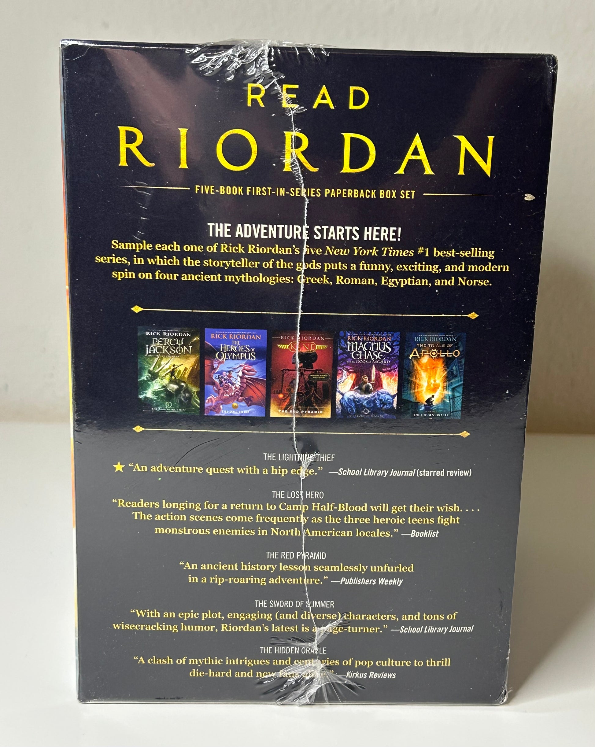 Box set includes: Percy Jackson and the Olympians: THE LIGHTNING THIEF; The Kane Chronicles: THE RED PYRAMID; The Heroes of Olympus: THE LOST HERO; Magnus Chase and the Gods of Asgard: THE SWORD OF SUMMER; The Trials of Apollo: THE HIDDEN ORACLE