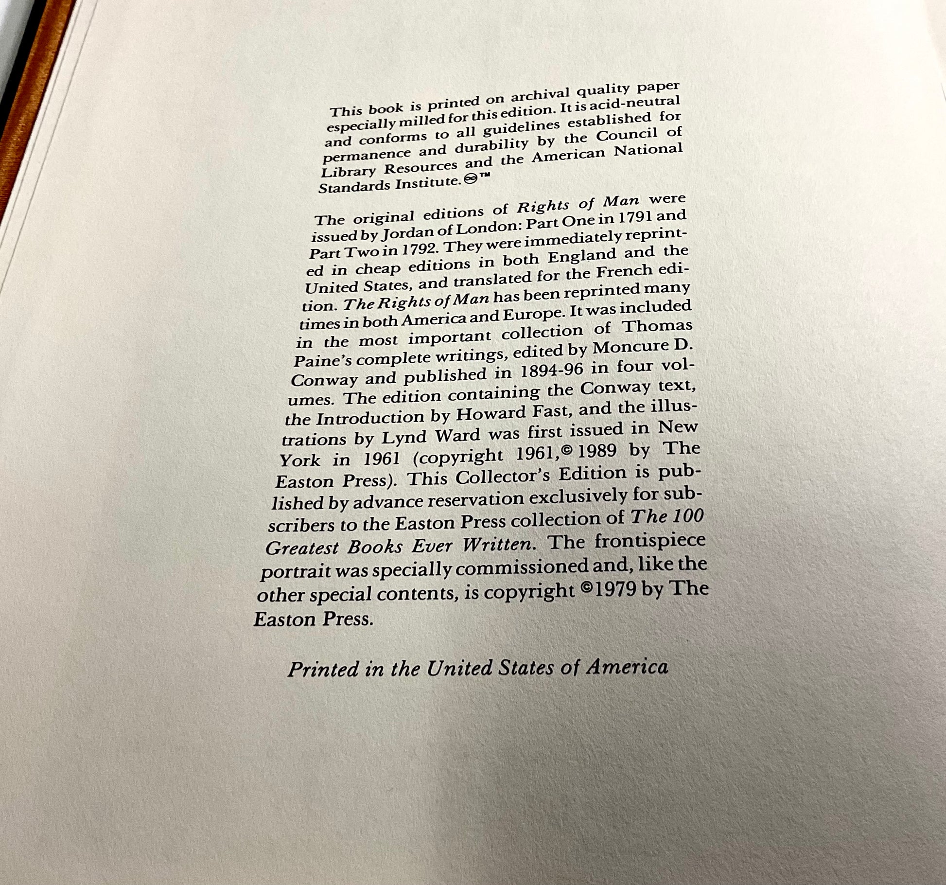 Rights of Man by Thomas Paine Vintage 1979 The Easton Press 100 Greatest Books Ever Written Collector's Edition Leather Bound in Genuine Leather Hardback Hardcover Book Excellent Condition. 100% of sale benefits charity.