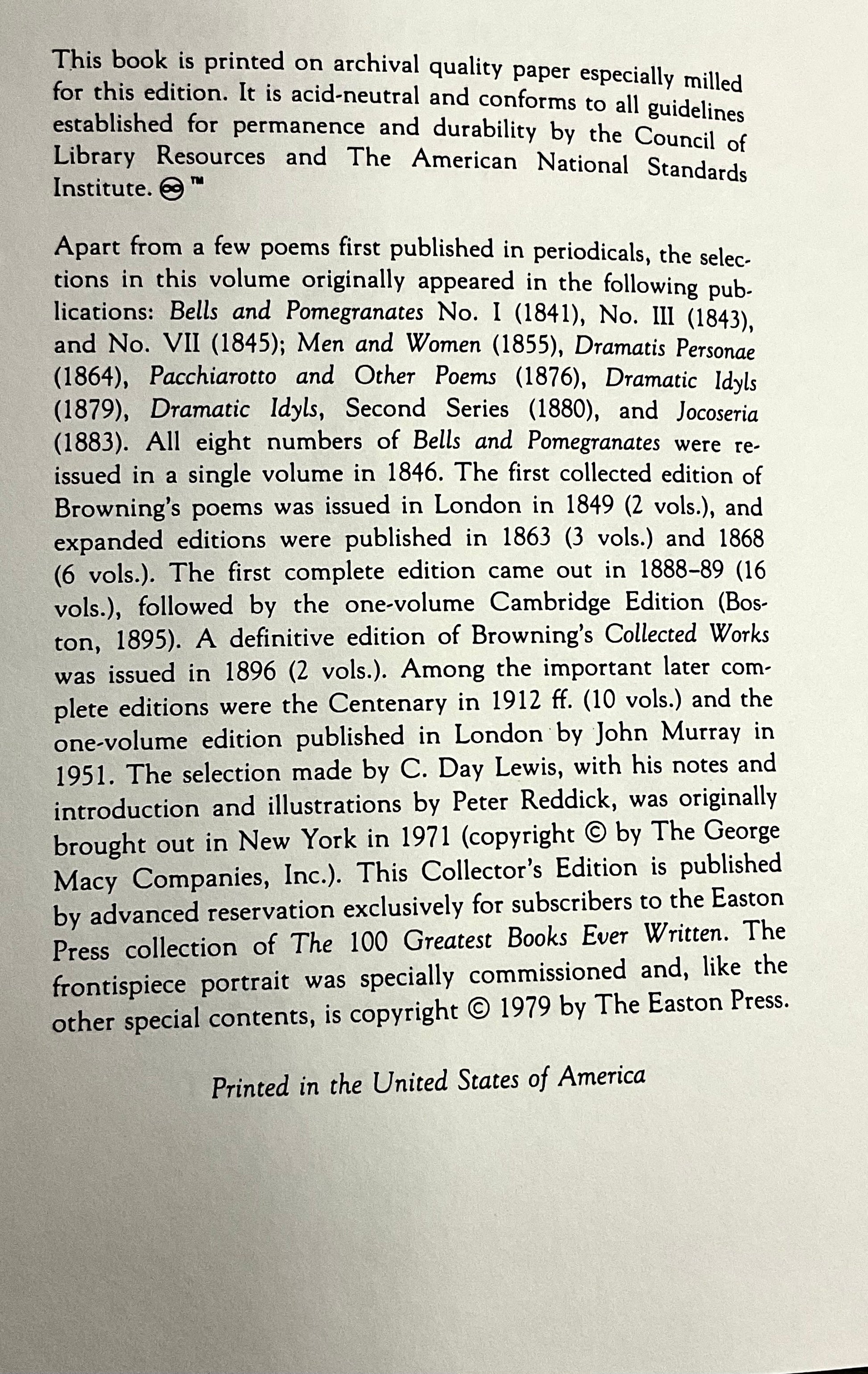 The Poems of Robert Browning Vintage 1979 The Easton Press 100 Greatest Books Ever Written Collector's Edition Leather Bound in Genuine Leather Hardback Hardcover Book Excellent Condition. 100% of sale benefits charity.