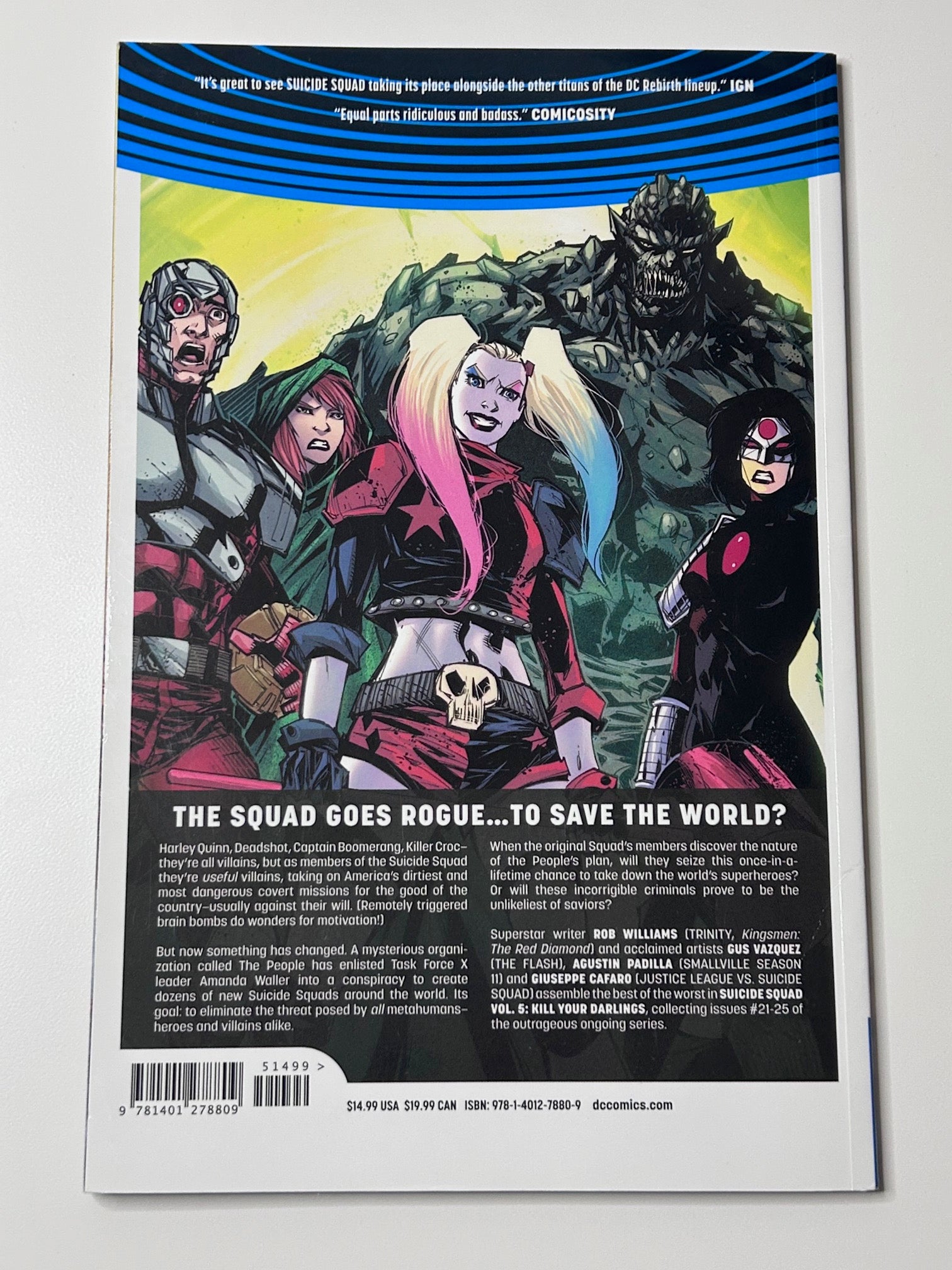 Suicide Squad Volume 5 Kill Your Darlings DC Universe Rebirth Comic Book Graphic Novel Paperback u2013 April 17, 2018 by Rob Williams (Author), Gus Vazques (Contributor), Agustin Padilla (Contributor), Adriano Lucas (Illustrator), Pat Brosseau (Illustrator). 100% of sale benefits charity.