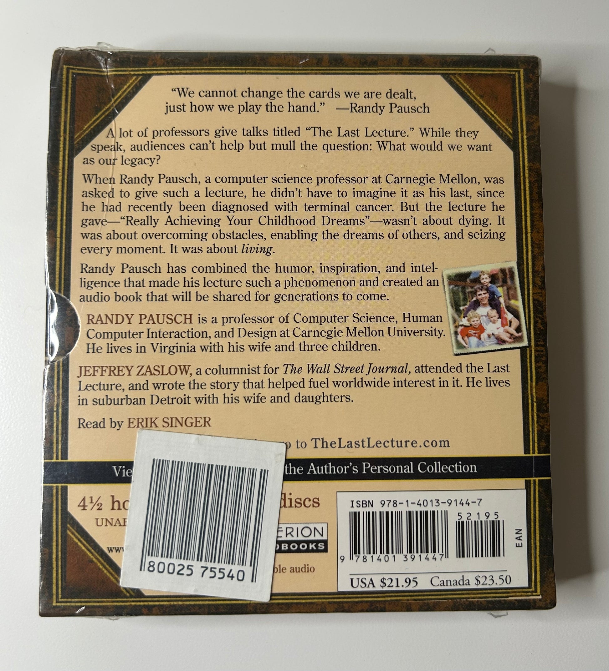 The Last Lecture by Randy Pausch Unabridged Audio Book 4 CD Read Set Erik Singer. Brand New Sealed. 4 Compact Discs. Factory Sealed. Never Opened. 4 1/2 Hours. Unabridged. National Bestseller. Includes personal photographs from the author's collection. The lecture, his last, isn't about dying - instead it's about overcoming obstacles, enabling the dreams of others, and LIVING!