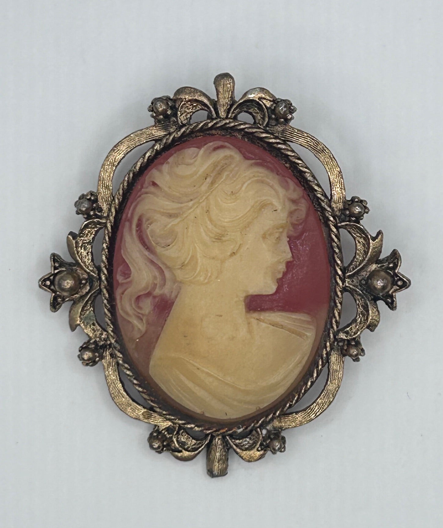 Victorian Style Woman Oval Cameo Brooch Ribboned Edge Antiqued Gold Tone Pin Red and White Bust Victorian Style